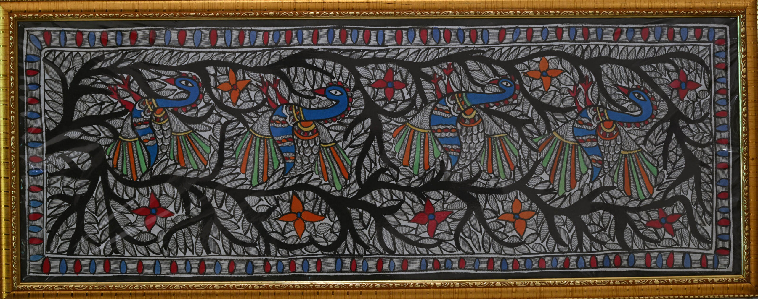 Five radiant peacocks bloom like petals on a sacred tree, their vibrant feathers echoing the cycles of nature. Intricate black-and-white foliage surrounds them, weaving a tapestry of life, rhythm, and renewal. Floral motifs pulse with red and orange energy, grounding the composition in festive abundance. This Madhubani Tree of Life celebrates harmony between earth and spirit, where every line sings of creation and continuity.