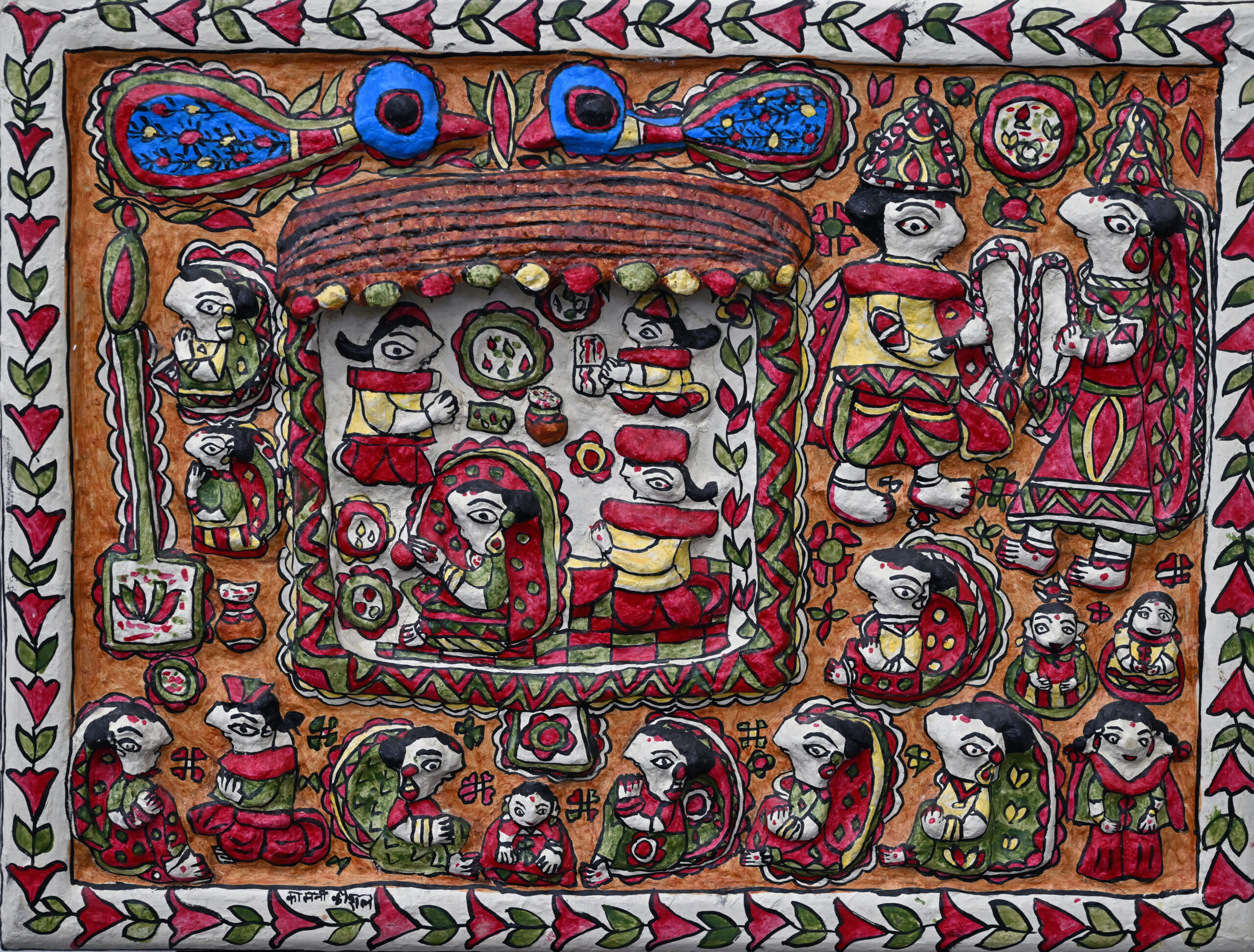 Inside a festively adorned structure, figures gather in ritual and celebration, their gestures echoing community and devotion. Surrounding scenes burst with music, dance, and ceremonial grace, each vignette a thread in the tapestry of tradition. Leaf motifs frame the painting like blessings, grounding the vibrant chaos in symmetry and reverence. This Madhubani artwork sings of collective joy—where every line honors heritage, and every color carries ancestral rhythm.