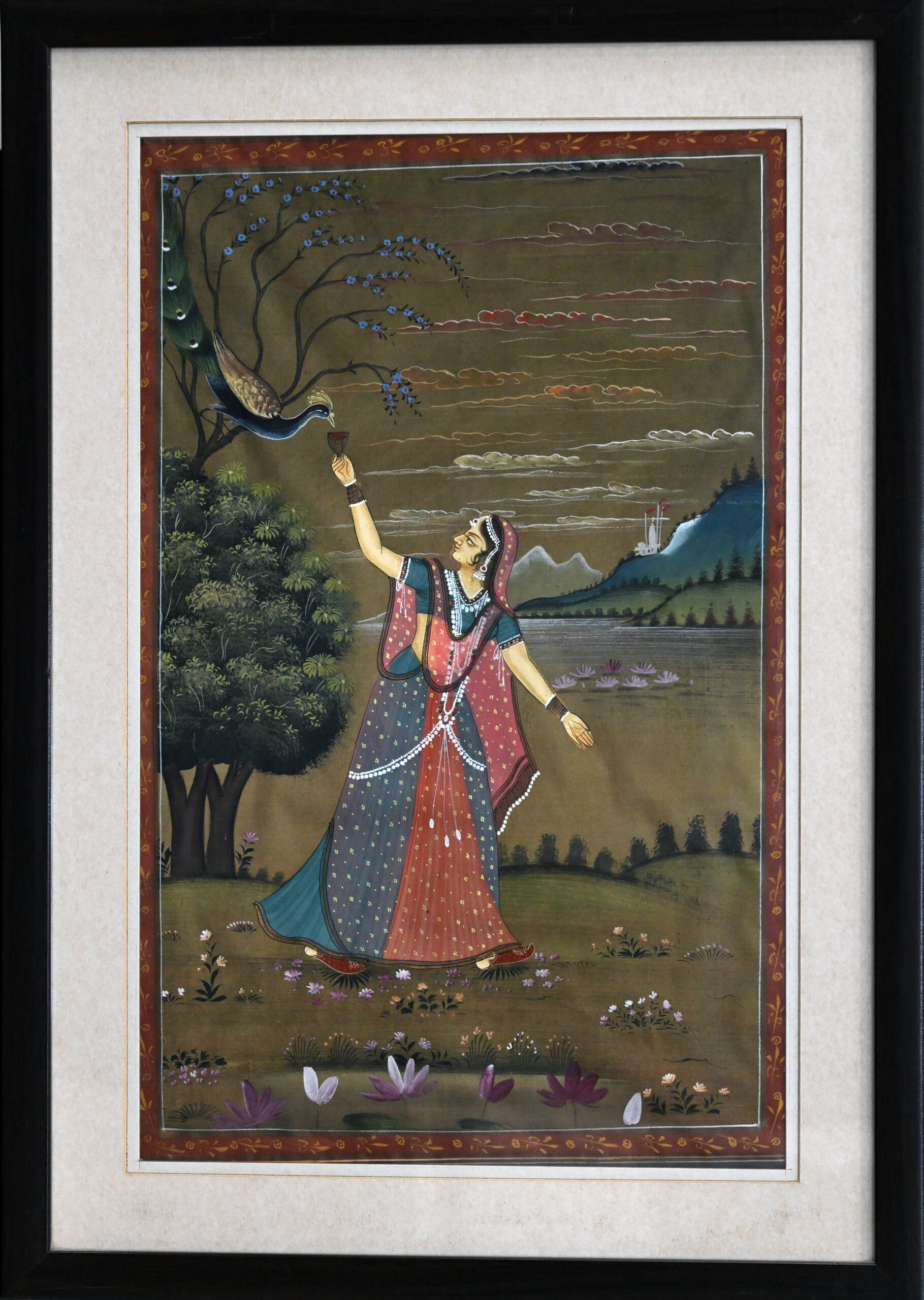 A graceful woman reaches toward a flowering branch, her gesture tender as twilight wraps the landscape in hush. Her attire—red, blue, and dotted with white—echoes the rhythm of tradition and the poetry of longing. Behind her, mountains, water, and trees breathe serenity, turning nature into a silent witness of her ritual. This miniature is a moment suspended in beauty, where feminine presence meets the sacred pulse of the earth.