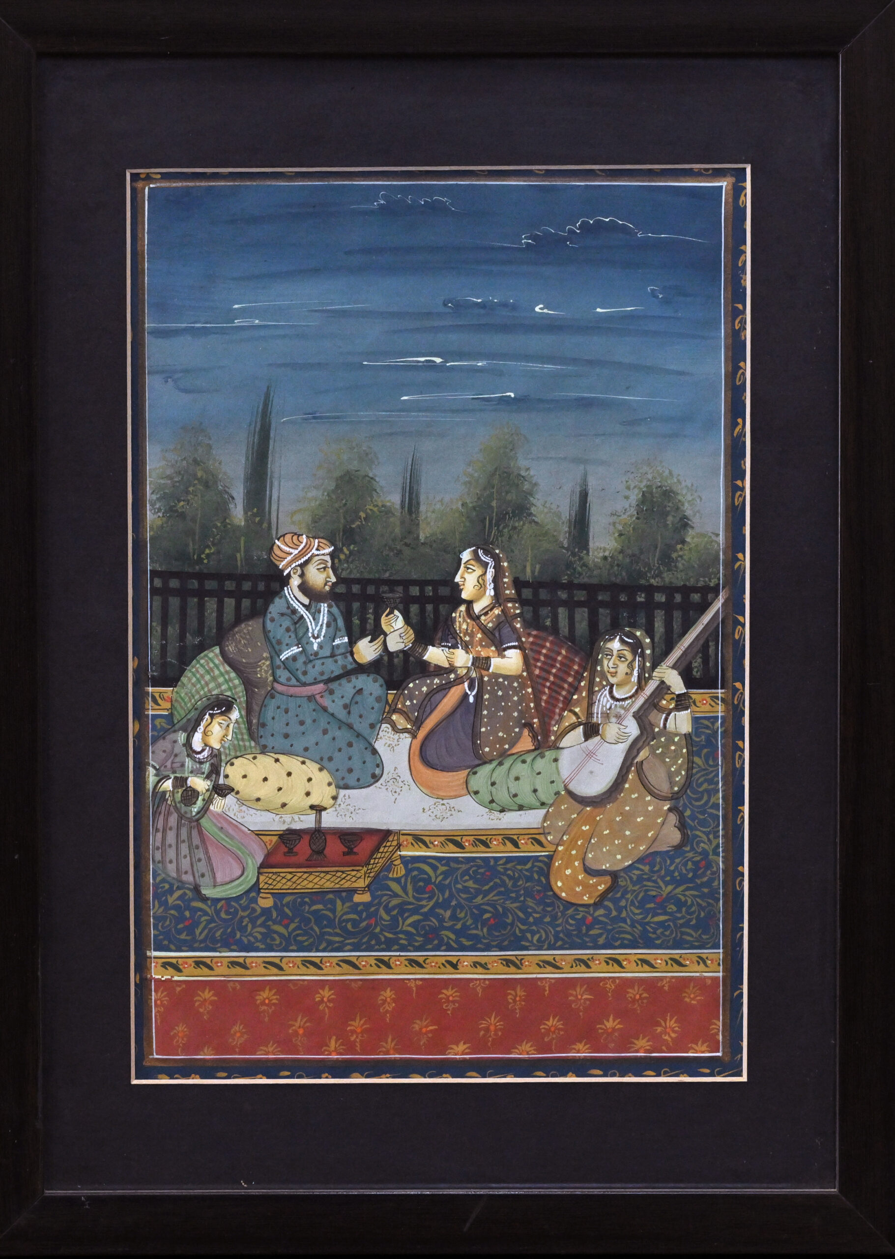 Beneath a twilight sky, a royal couple reclines on a white cloth, their intimacy framed by music and moonlight. Attendants flank them—one strumming a sitar, the other offering breeze—turning the garden into a stage of quiet devotion. The trees stand tall like sentinels of love, while the ornate carpet anchors the scene in regal elegance. This miniature whispers of leisure and longing, where nature, nobility, and emotion entwine in delicate harmony.