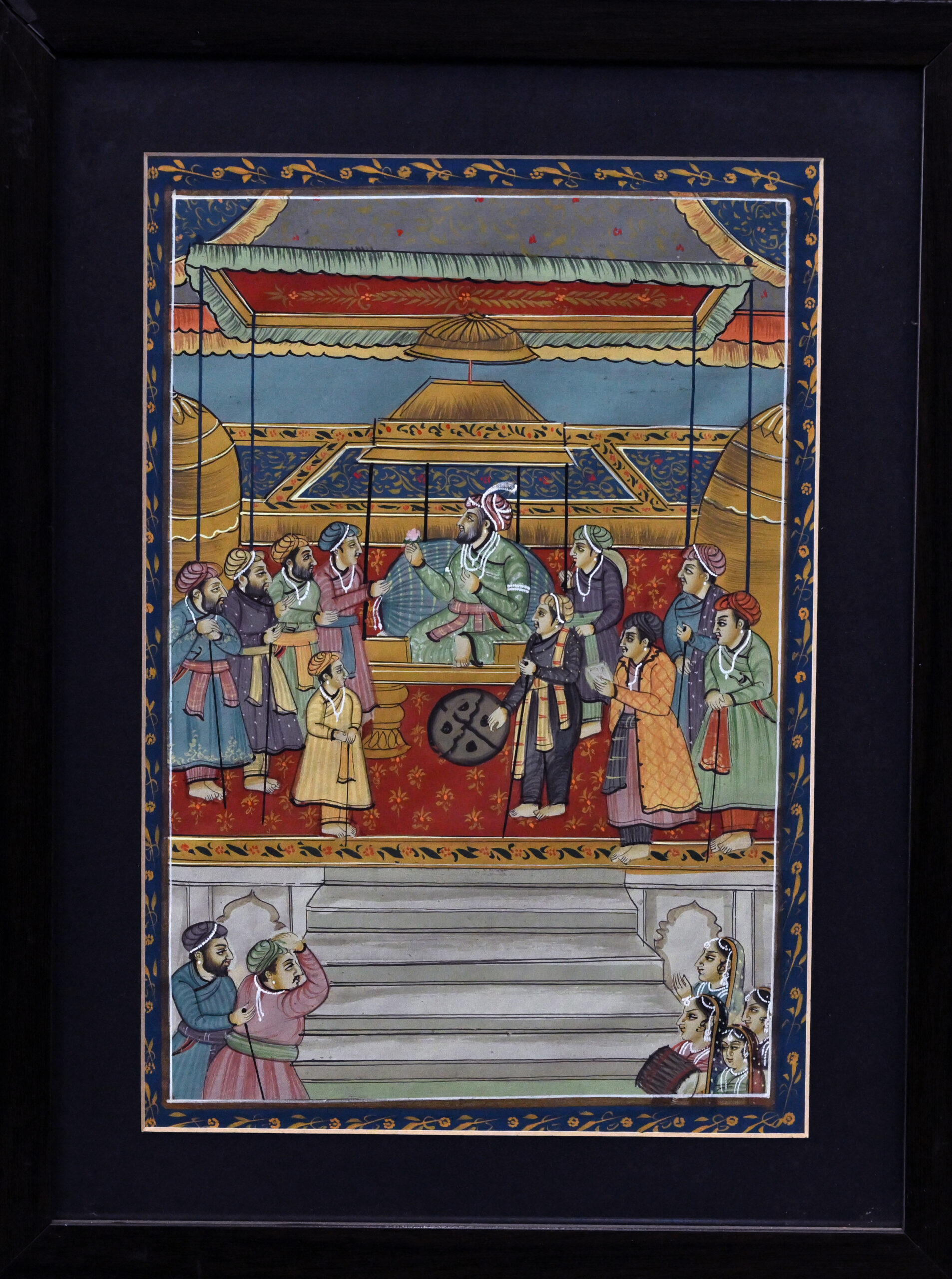 A regal figure sits enthroned beneath a golden canopy, radiating authority as attendants and officials gather in reverent symmetry. The architecture frames the scene like a jewel box—ornate, balanced, and steeped in ceremonial grace. Below, commoners or performers ascend the steps, bridging the divine and the earthly in a gesture of cultural unity. This miniature whispers of dynastic grandeur, where power is ritualized and every detail sings of legacy.