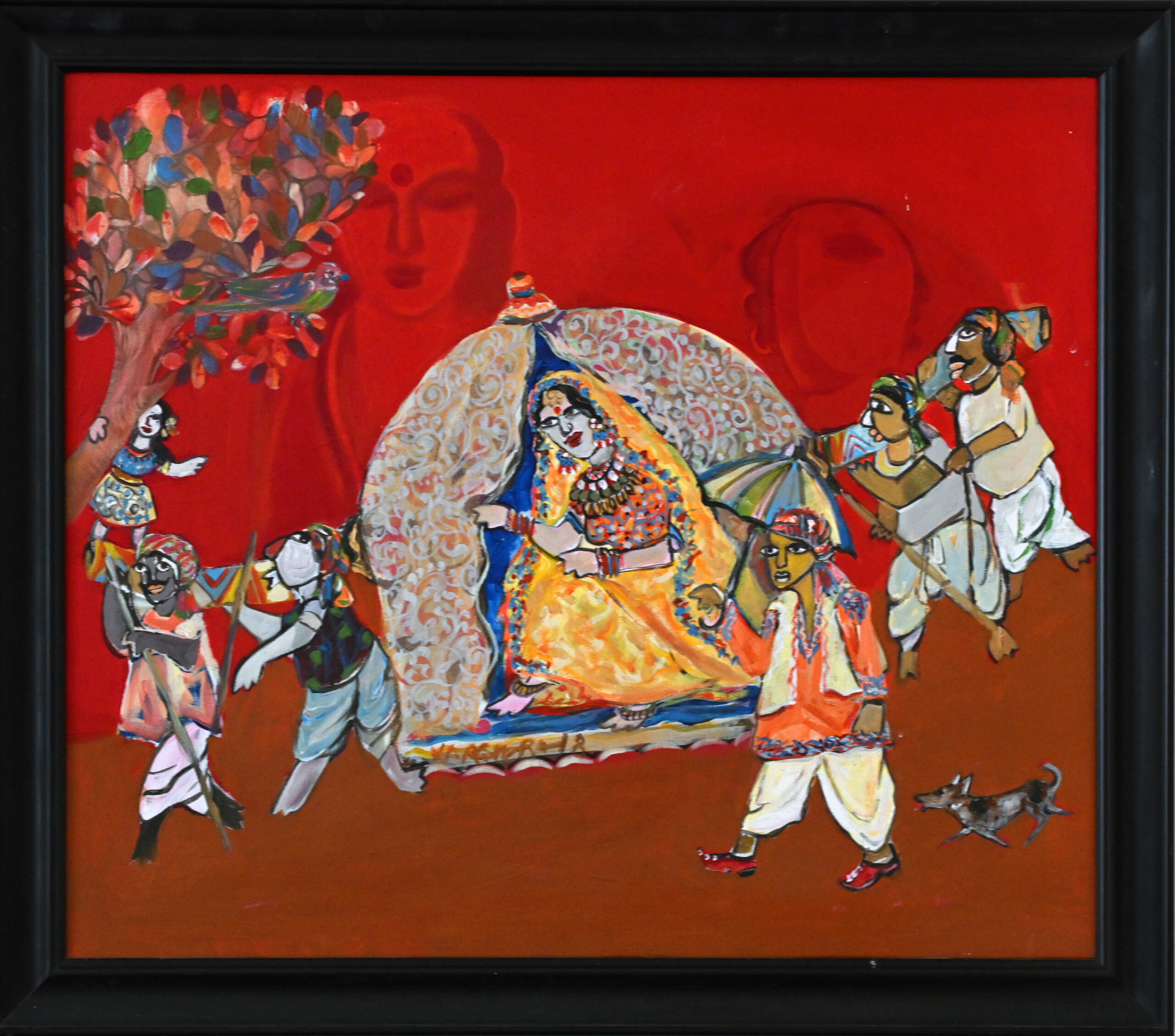 A radiant bride rests within a palanquin, her stillness cradled by the rhythm of a jubilant procession. Musicians, carriers, and a ceremonial umbrella-bearer encircle her like verses in a wedding hymn, while a small dog watches with quiet curiosity. The red backdrop blooms with ancestral faces and a stylized tree, evoking lineage, fertility, and festive transcendence. Narendra Pal Singh paints not just a moment, but a cultural heartbeat—where tradition dances and devotion carries love forward.