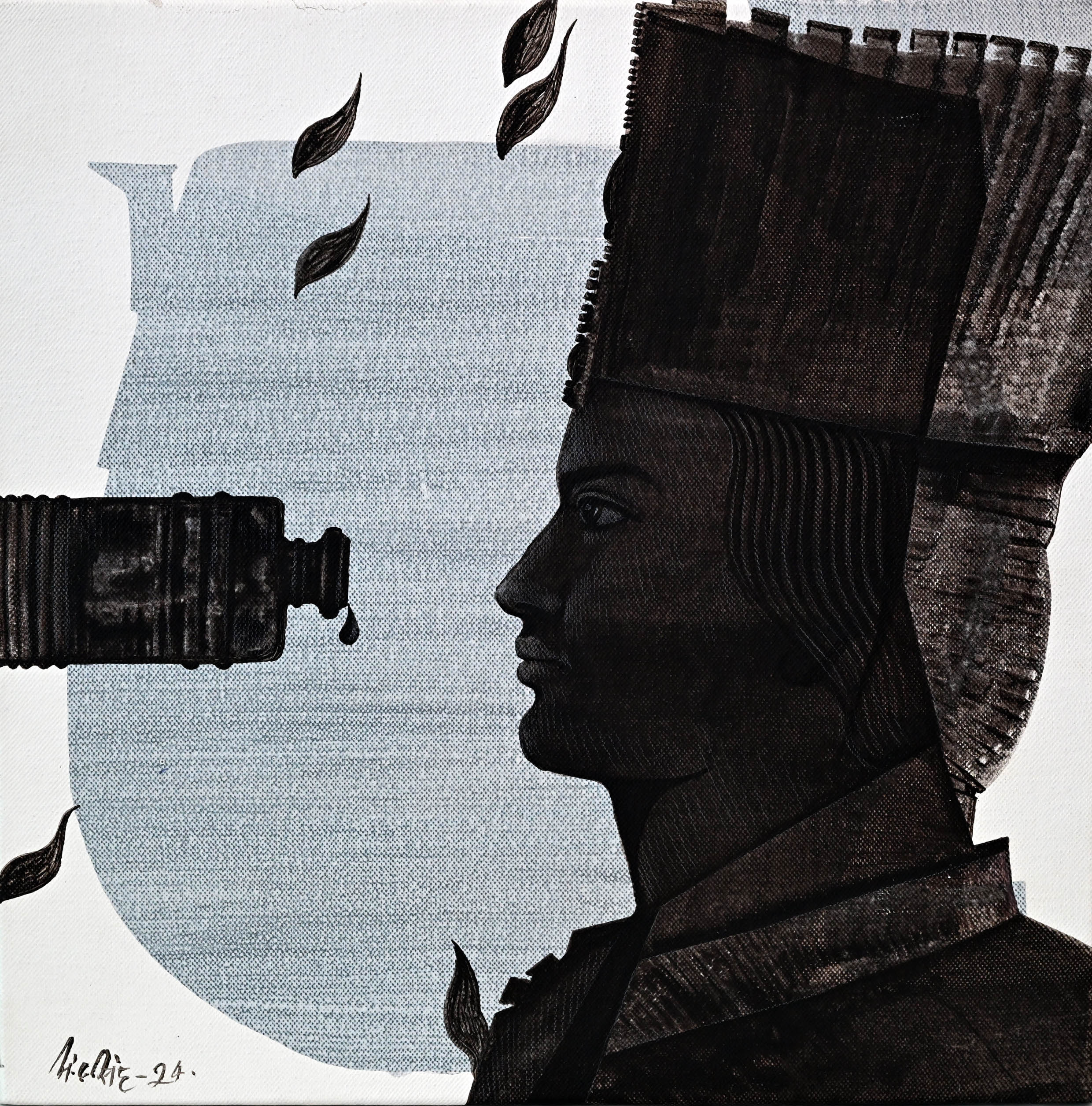 A silhouette crowned with an ornate headdress meets the gaze of a camera lens, where technology drips into tradition like a ritual offering. The falling droplet, poised at the mouth, evokes a surreal communion—between observer and observed, media and memory. Leaf-like forms and a shadowy urn hover in the background, suggesting cycles of growth, containment, and ancestral presence. Umendra Pratap Singh’s composition becomes a poetic tension between cultural identity and modern perception, rendered in quiet, symbolic drama.