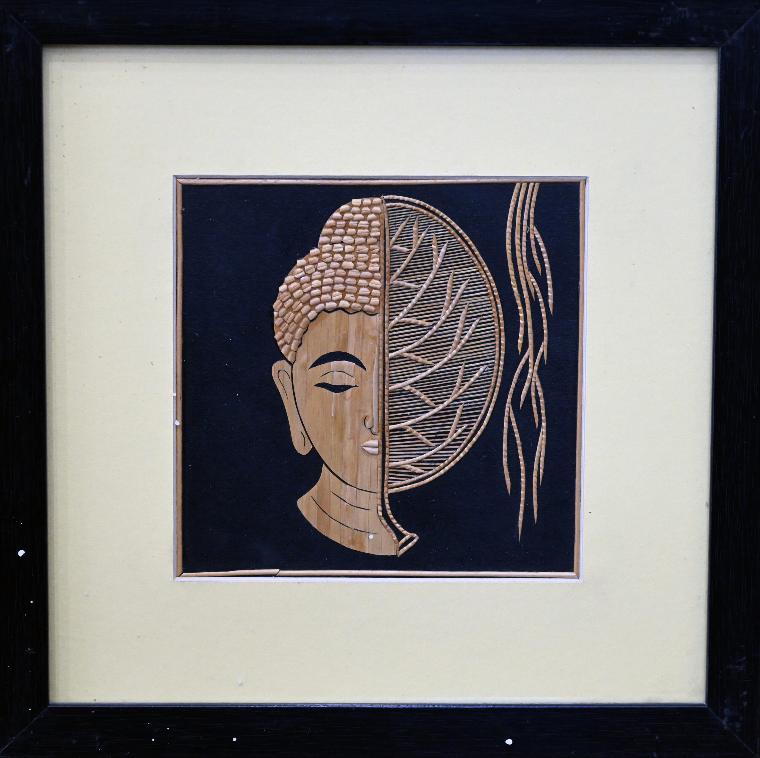 Buddha’s tranquil face merges with a leaf’s delicate veins, uniting spirit and nature in quiet grace. The closed eyes evoke deep meditation, while the leaf unfurls like a symbol of growth, renewal, and rooted wisdom. Flowing lines beside it resemble vines or breath—threads of life connecting the earthly and the divine. This artwork is a serene fusion, where enlightenment blossoms from stillness and organic form.