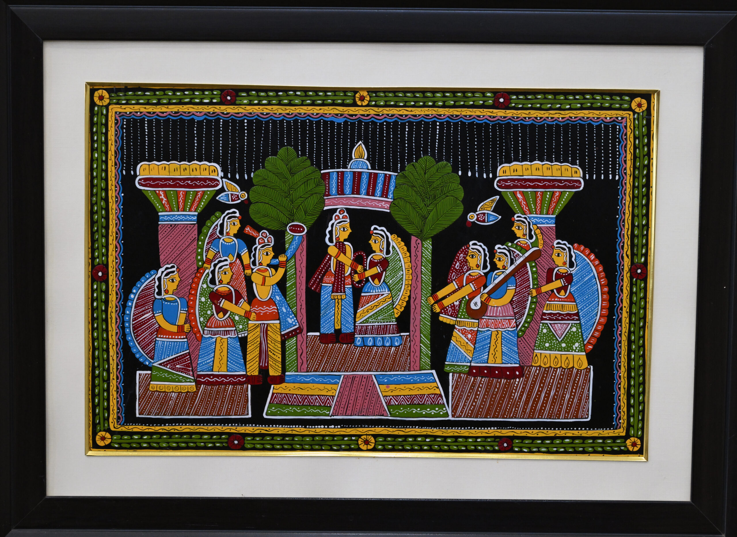 Beneath a canopy of trees, figures gather in vibrant celebration—musicians, dancers, and seated elders woven into ritual. Each detail sings with Madhubani grace: bold lines, radiant colors, and symmetrical storytelling that honors tradition. The central throne glows with reverence, suggesting divinity or royalty at the heart of communal joy. This is a visual festival, where…
