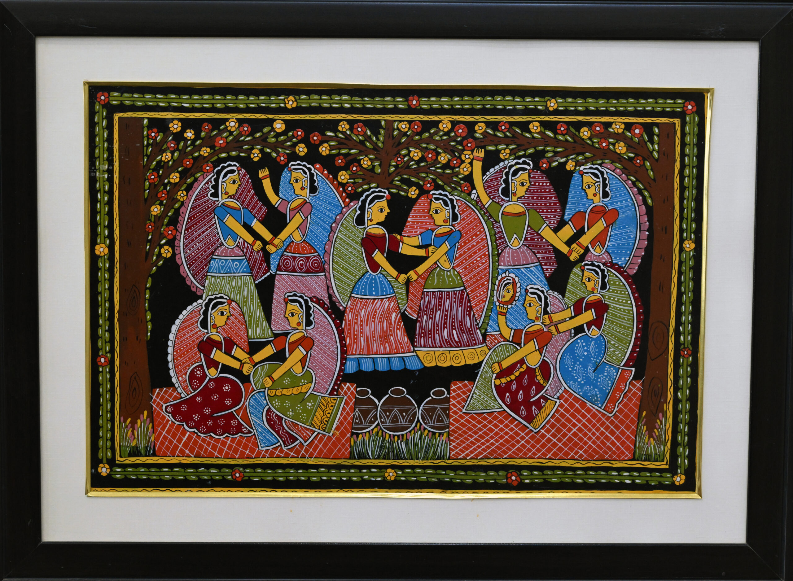 Under a fruit-laden tree, women adorned in vibrant attire dance in joyous rhythm, their gestures echoing ritual and celebration. Each figure is delicately detailed—jewelry, hairstyles, and flowing garments rendered with loving precision. The symmetrical composition and ornate patterns pulse with the spirit of Madhubani, where nature and community intertwine. This is a festival in motion, a tapestry of feminine grace and cultural reverence.