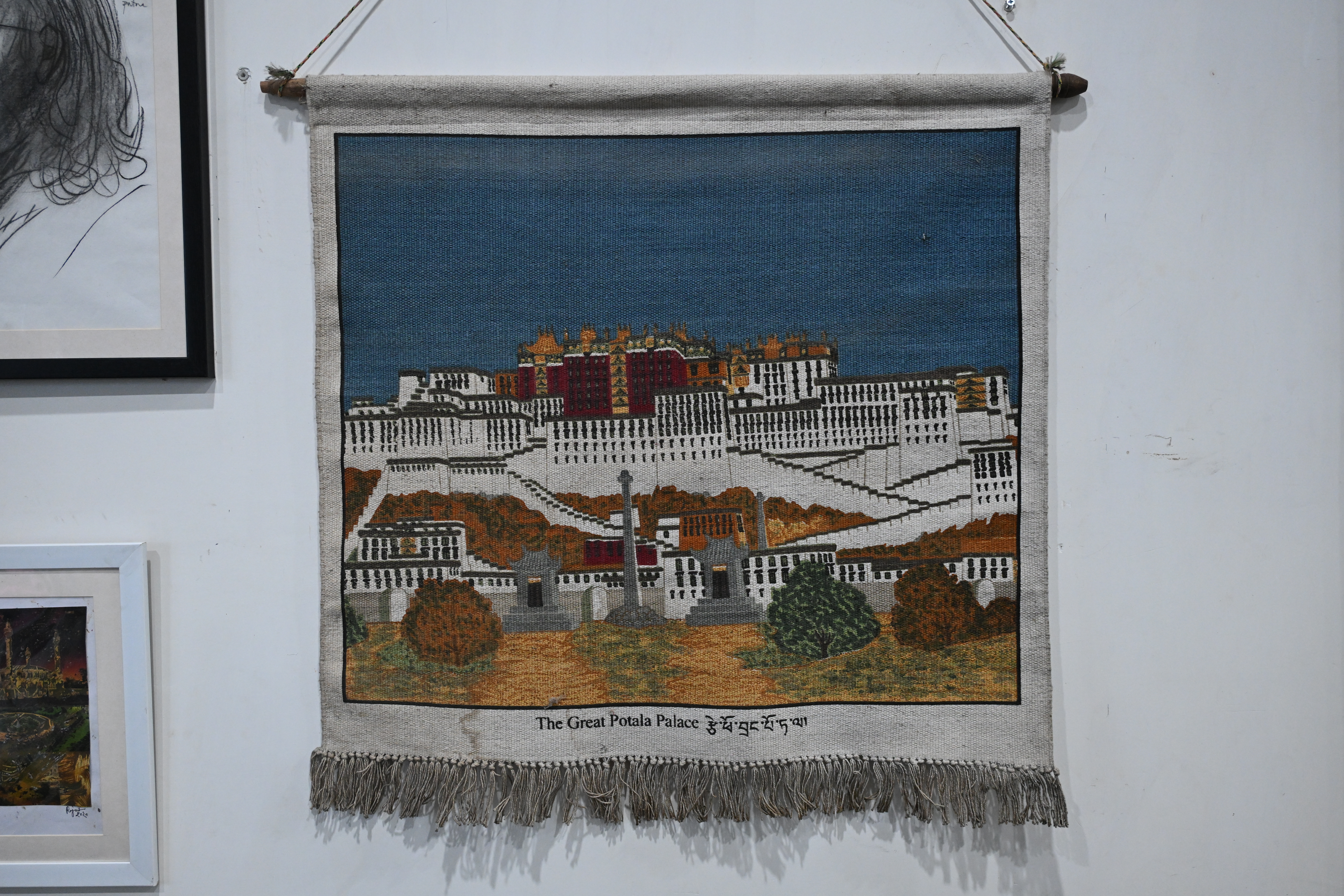 The Potala Palace rises in woven threads, its white and red tiers glowing against a twilight blue sky. Sonam Phuntsok captures the sacred heart of Lhasa with intricate detail, where each stitch honors history and devotion. Trees and pathways guide the eye upward, as if inviting pilgrimage through texture and time. This tapestry is not just textile—it is reverence made visible, a shrine suspended in cloth.