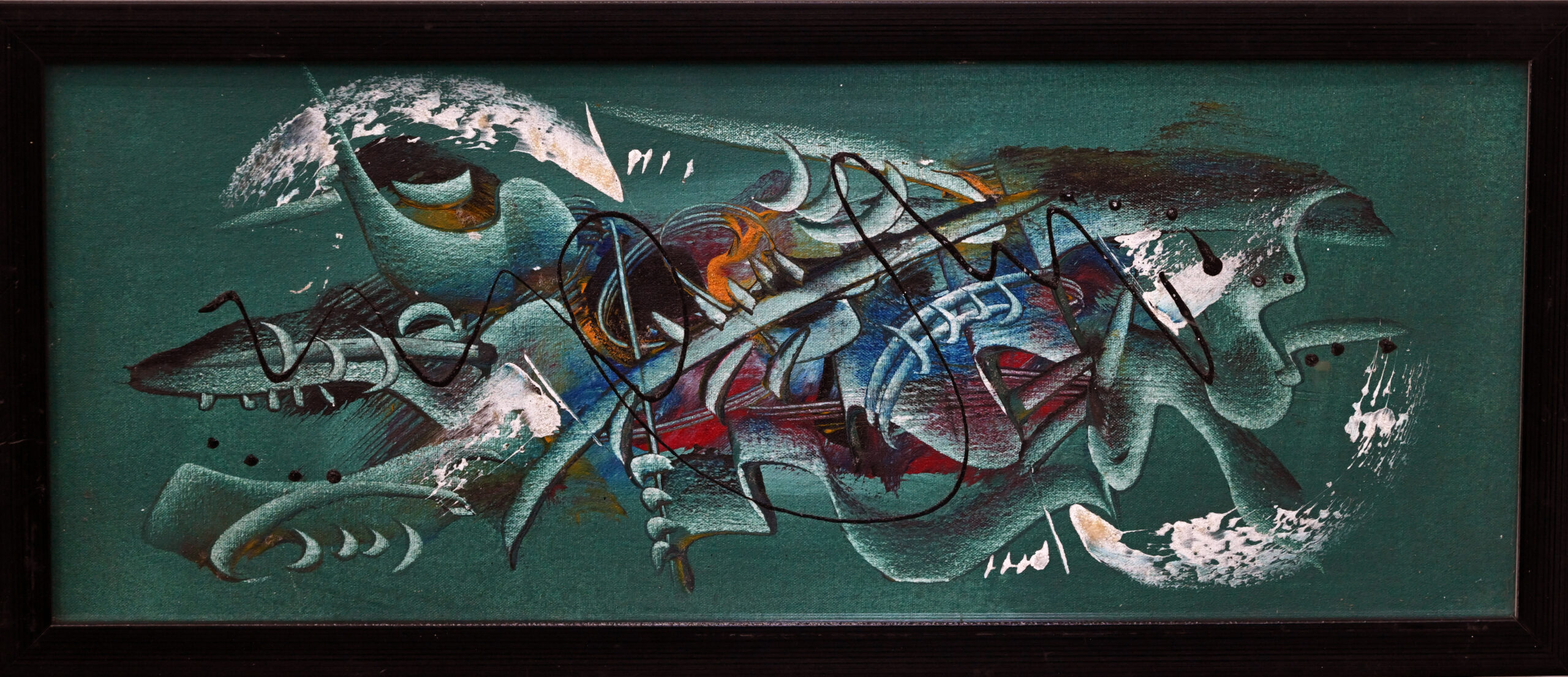 Swirling shapes burst across a green canvas, their layered colors weaving chaos into vibrant rhythm. Red, blue, white, and orange lines twist and collide, creating a tapestry of motion and emotion. The composition feels alive—each stroke a pulse, each curve a breath in abstract harmony. This painting is a dance of energy, where complexity becomes…