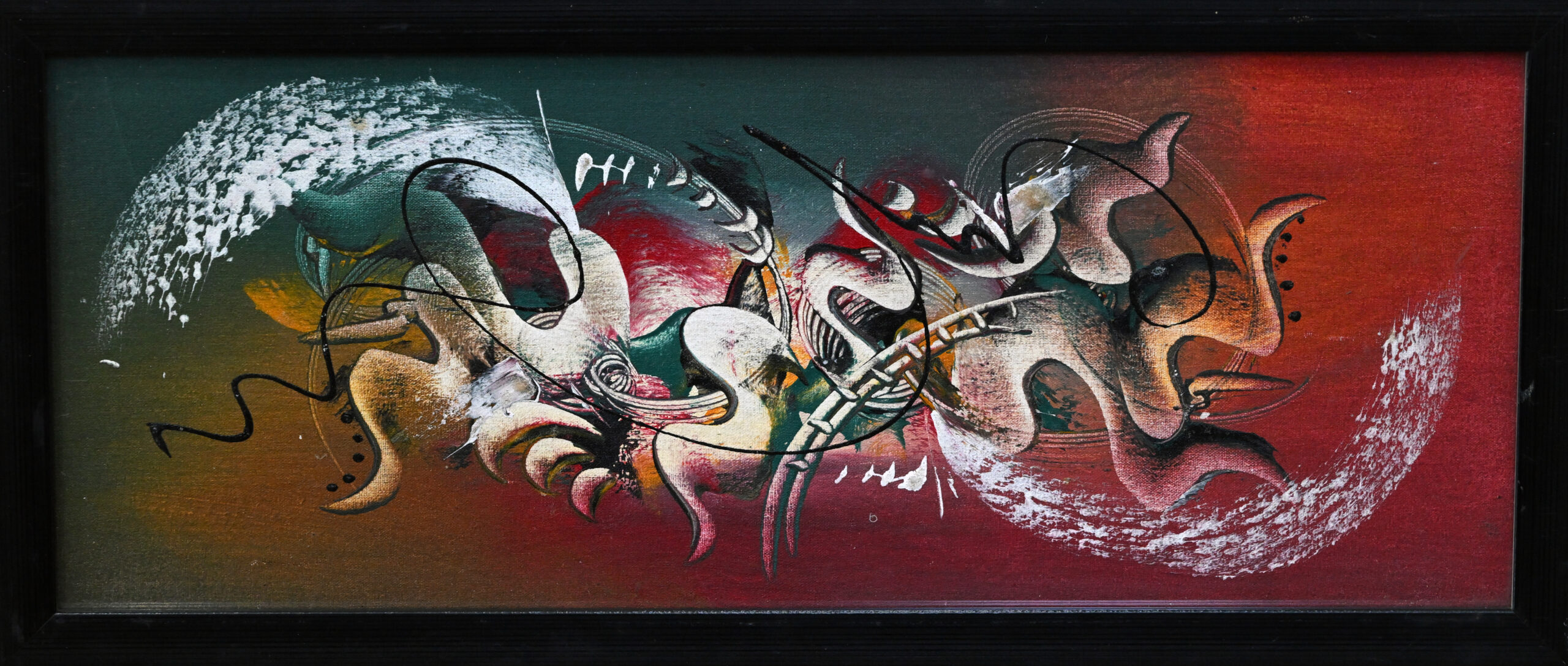 Swirling forms dance across a canvas split by color—green fading into red like dusk meeting flame. In the center, organic shapes twist and pulse with energy, their textures alive with motion and mystery. White brushstrokes anchor the edges, balancing chaos with quiet rhythm. This abstract piece is a storm of feeling, where color and line become breath and heartbeat.