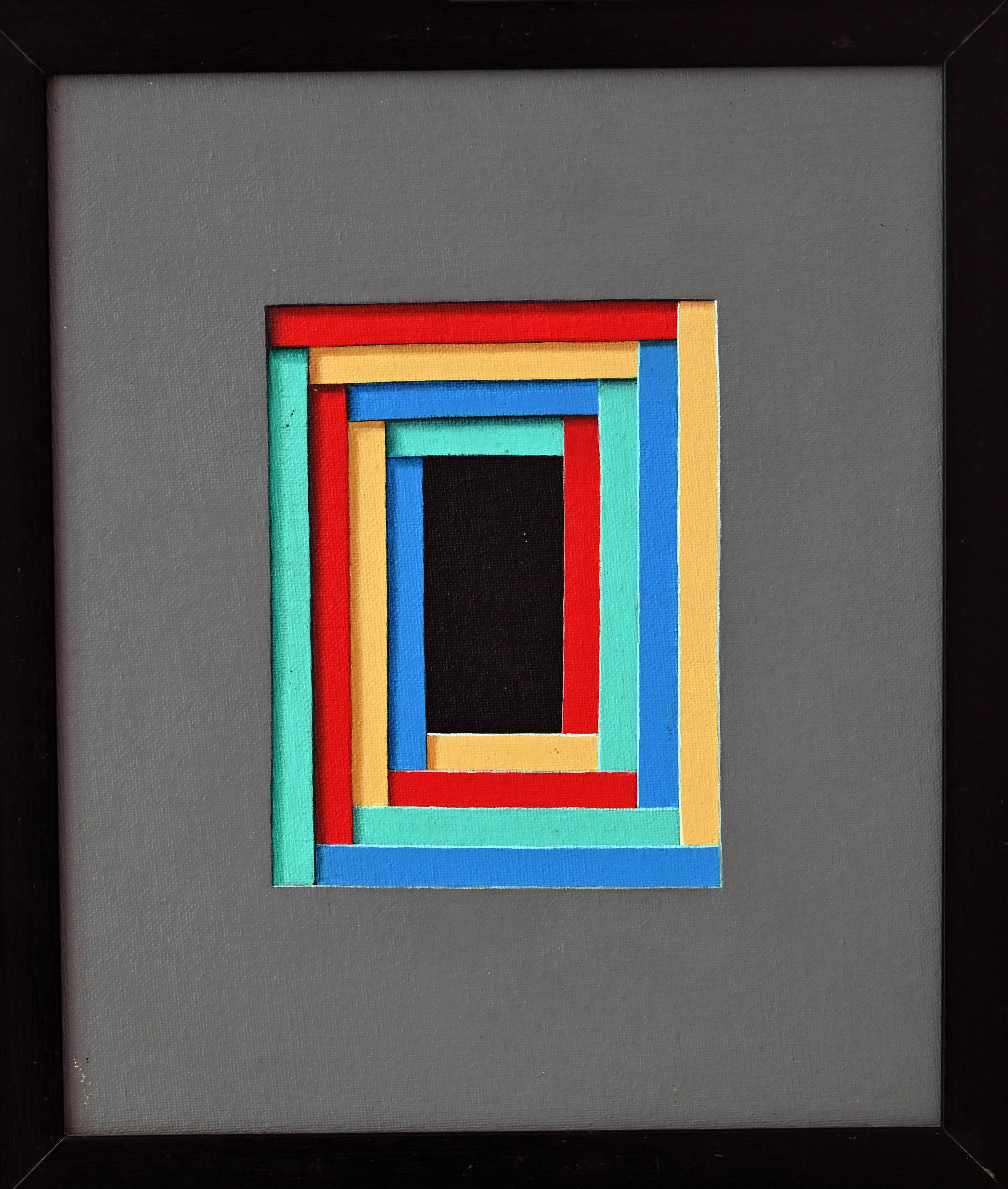 Concentric rectangles pulse with vibrant rhythm—red, yellow, turquoise, and blue orbiting a central black void. Each layer draws the eye inward, as if color itself were a path to contemplation. The geometry feels both playful and meditative, balancing precision with emotional resonance. In this abstraction, depth emerges from repetition, and silence is framed in radiant hues.