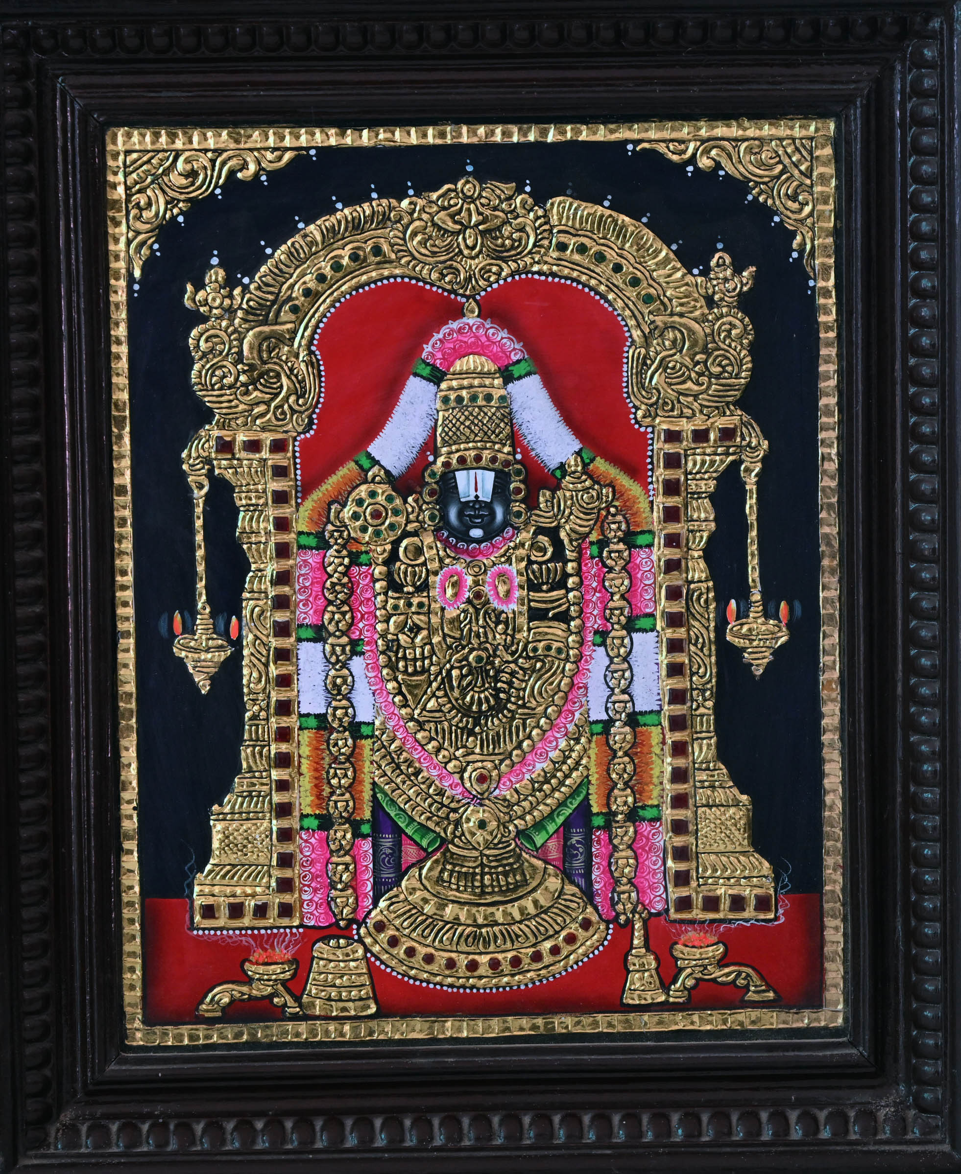Lord Venkateswara stands radiant in this Tanjore painting, adorned with intricate gold ornaments and vivid garlands that evoke divine opulence. The dark backdrop intensifies the brilliance of the gold foil, creating a celestial aura around the deity. Framed by an ornate archway, each carved detail echoes centuries of South Indian devotion and craftsmanship. This sacred portrait is not just visual—it’s a ritual of reverence, shimmering with spiritual presence and ancestral grace.