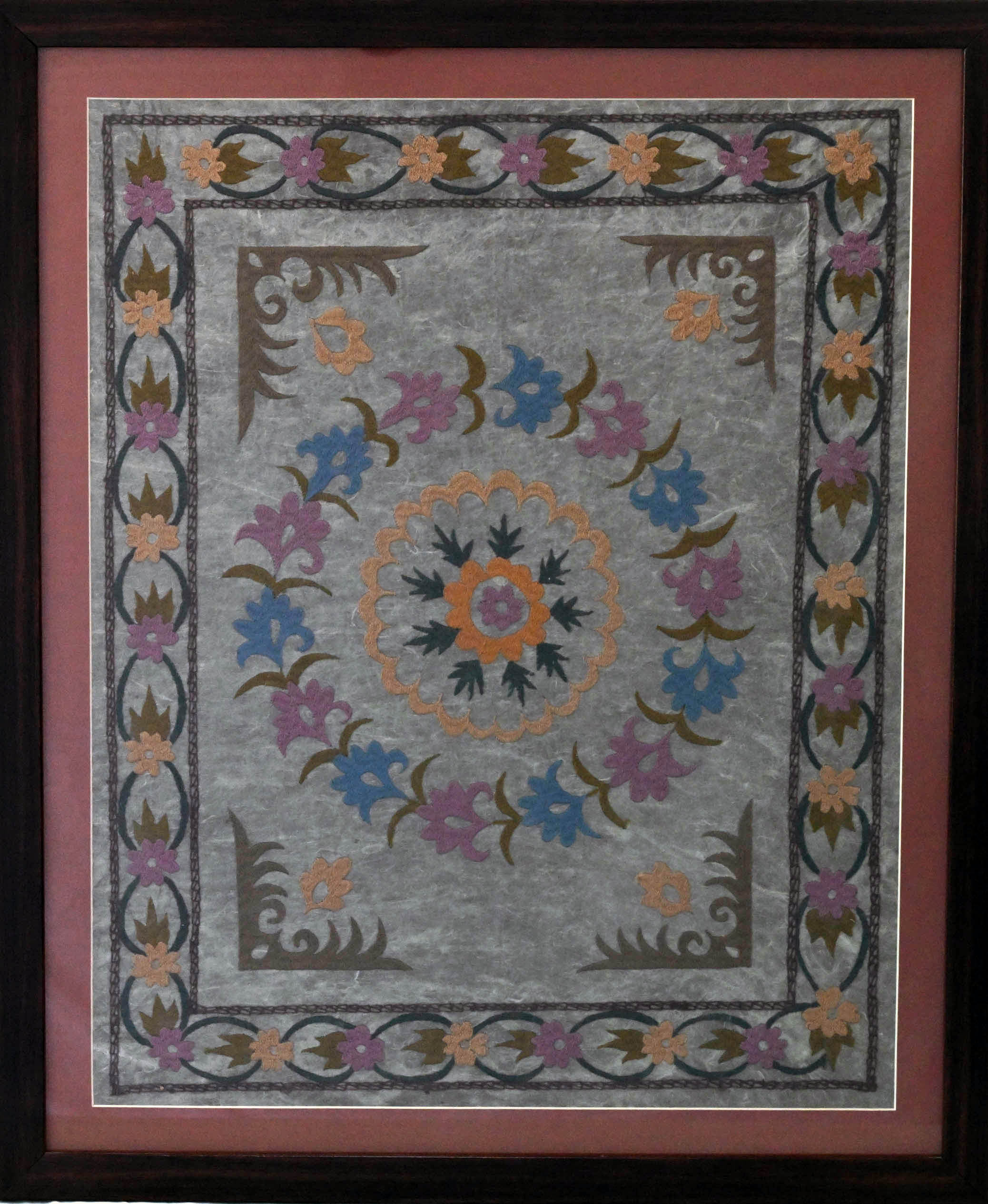 This symmetrical floral artwork blooms like a mandala—radiating harmony, ritual, and vibrant grace. At its heart, an orange flower anchors the design, encircled by blue and pink blossoms in rhythmic balance. The outer border dances with leafy patterns in earthy hues, set against a textured gray that quiets the vibrancy into contemplation. Framed in maroon and wood, the piece feels like a ceremonial textile—woven with joy, symmetry, and seasonal spirit.
