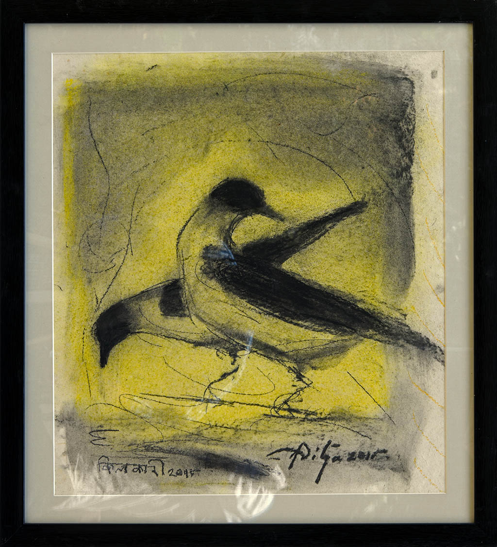 Two birds, rendered in urgent black strokes, seem to converse mid-flight—caught between gesture and silence. The yellow backdrop radiates a quiet intensity, evoking both sunlight and spiritual illumination. Their overlapping forms suggest kinship or conflict, a duality often present in Basak’s symbolic narratives. Beneath the surface, the sketch whispers of transience, migration, and the fragile…