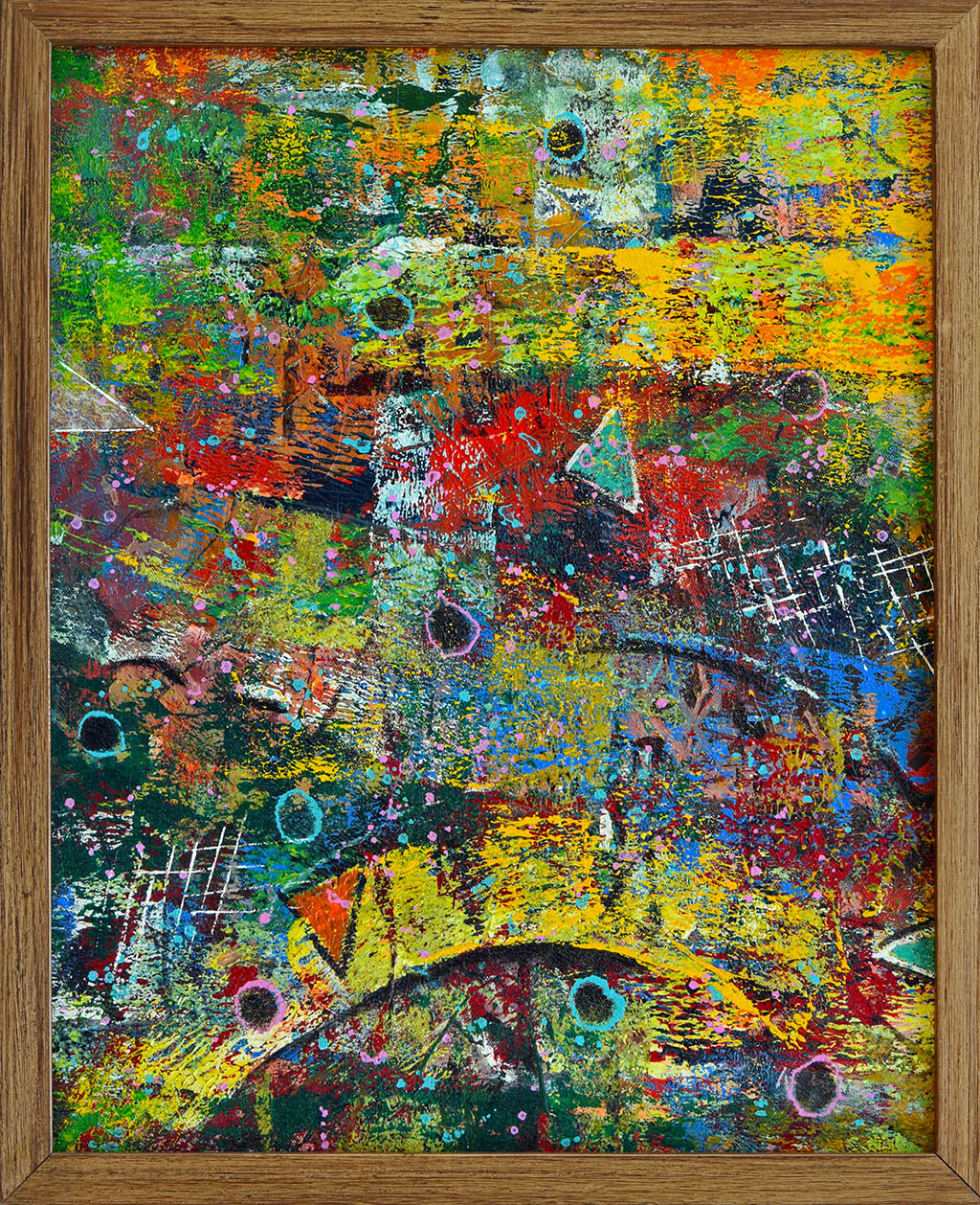 Ajay Narayan’s painting erupts in a jubilant chaos of color and form, where triangles, circles, grids, and splatters collide in a dance of abstraction. The palette—bold yellows, reds, greens, and blues—radiates kinetic energy, as if capturing a moment of spontaneous creation or emotional release. Amid the layered textures and dynamic brushwork, the canvas feels like a coded landscape, rich with symbols yet defiantly untranslatable. It is a celebration of complexity, where meaning is felt more than deciphered, and movement becomes the message.