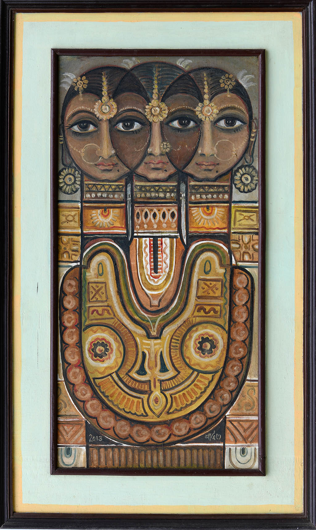 This intricate painting by Anandi Prasad Badal presents a stylized triadic portrait of feminine divinity, where three elaborately adorned female faces converge into a single, symmetrical body. The composition is rich with geometric and ornamental motifs reminiscent of traditional Indian textile and folk art, rendered in earthy tones of ochre, sienna, and umber with accents of white and black. Each face is crowned with detailed jewelry and headpieces, suggesting ritual significance and cultural continuity. Badal’s visual language evokes themes of unity, multiplicity, and spiritual embodiment, blending folk aesthetics with contemporary stylization to create a compelling iconographic tableau that resonates with both heritage and innovation.