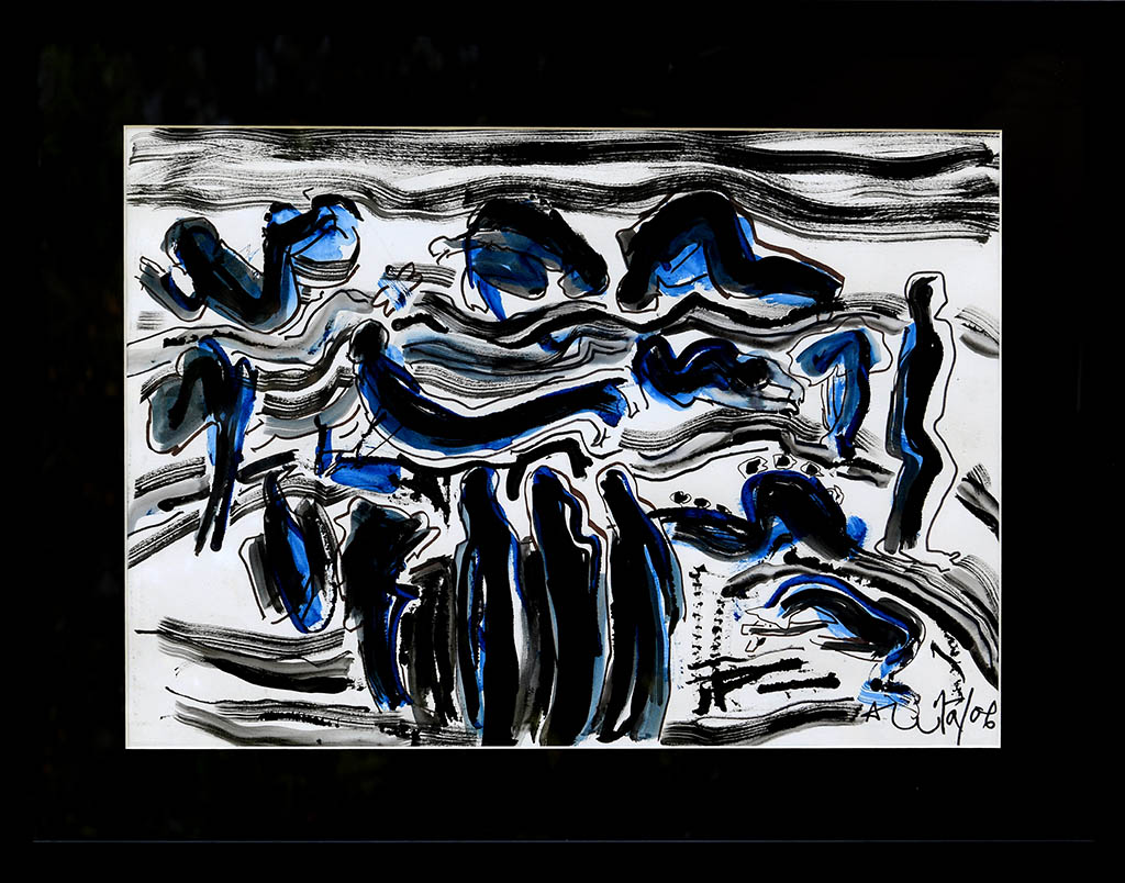 Anita’s abstract composition unfolds as a rhythmic dance of human forms, rendered in bold black and blue strokes. The figures stretch, recline, and reach across a swirling backdrop, evoking motion, emotion, and collective energy. Blue highlights punctuate the gestures, suggesting intensity, vulnerability, or spiritual resonance. It’s a visceral tableau—where bodies become brushstrokes and movement becomes memory.