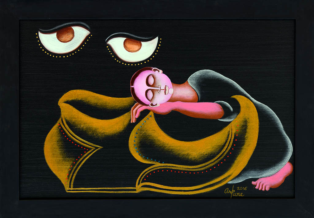 Arpana Caur’s surreal composition unfolds like a meditation on sleep, memory, and cosmic witness—where a reclining pink figure rests upon a golden, book-like form, eyes closed in inward retreat. Hovering above, two disembodied eyes gaze silently, surrounded by ritualistic dots, as if watching over dreams or ancestral truths. The stark black background intensifies the drama, turning the scene into a suspended moment between consciousness and myth. It is a painting of thresholds—between waking and dreaming, solitude and surveillance, flesh and spirit.