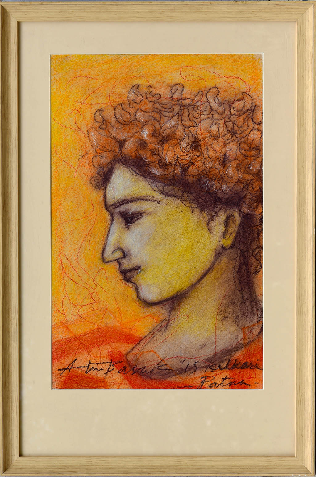 This stylized portrait by Atin Basak exemplifies his contemplative approach to figuration, where emotional resonance and symbolic texture converge. Rendered in warm, swirling hues of orange, red, and yellow, the profile of a curly-haired figure emerges with quiet introspection, defined by fluid lines and a subtle smile. The background’s dynamic movement contrasts with the subject’s…