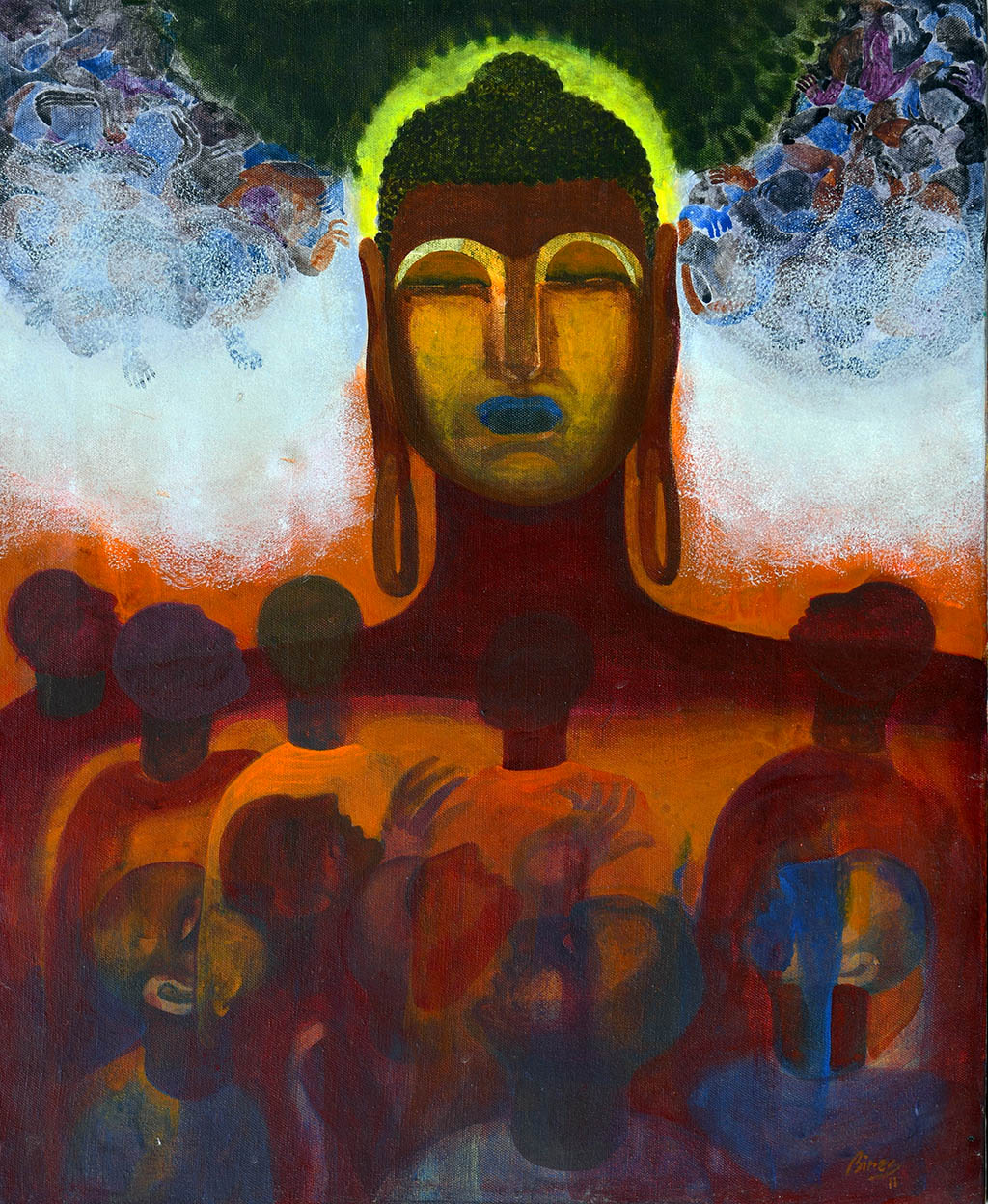 This radiant painting by Bireshwar Bhattacharya centers a glowing Buddha figure, rendered in warm reds and golds, radiating serenity and spiritual presence. The halo around the head symbolizes enlightenment, while the surrounding darker human forms gaze upward, embodying reverence and the human quest for transcendence. The background shifts from textured darkness to luminous light, creating…