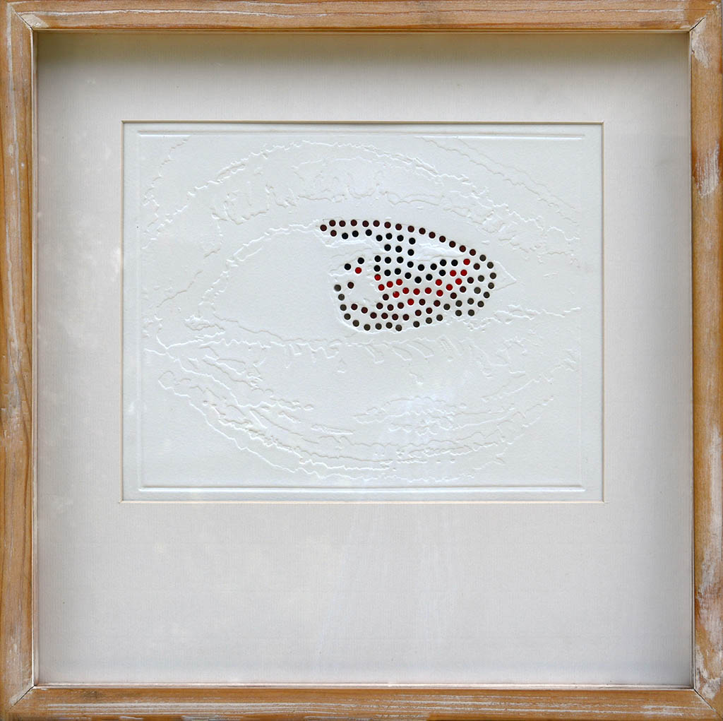 This tactile artwork by Deepak Sinkat evokes the human eye as a portal of perception, using embossed lines and perforated textures to suggest both clarity and mystery. The circular holes, some filled with red, form a striking iris that pulses with quiet intensity, inviting viewers to contemplate what lies beneath the surface. The interplay of light and shadow across the white background adds depth, while the rustic wooden frame grounds the piece in earthy elegance. It’s a meditation on vision—both literal and symbolic—where absence and presence coalesce into a soulful gaze.