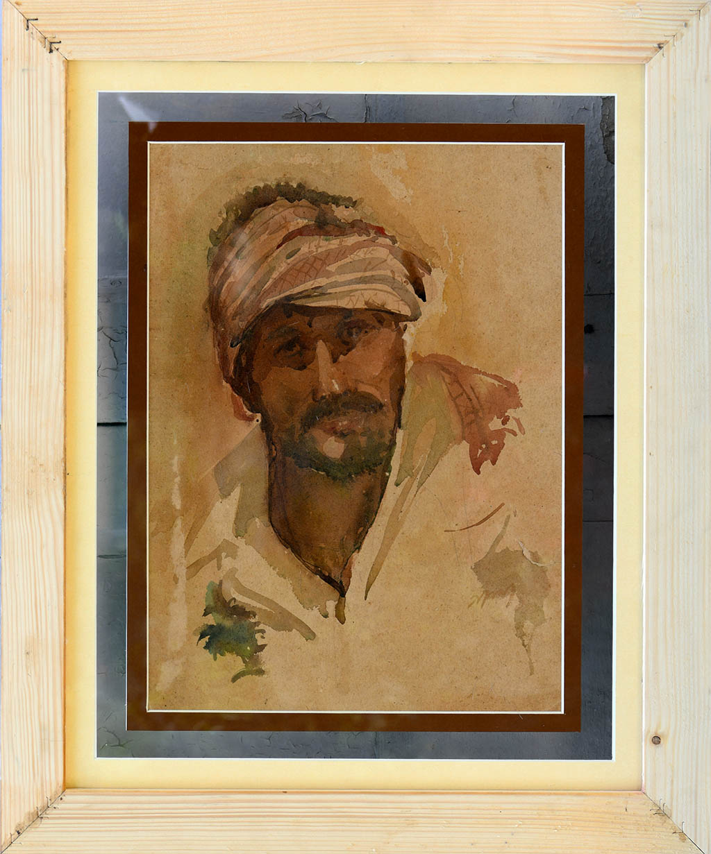 This portrait by Ganesh Haloi evokes quiet dignity through fluid brushwork and earthy tones. The man’s striped headscarf and robe are rendered with soft, expressive strokes that suggest both tradition and introspection. Haloi’s use of brown-toned paper and muted palette creates a timeless, contemplative atmosphere. The gaze, neither confrontational nor withdrawn, invites the viewer into a space of cultural memory and serene presence.