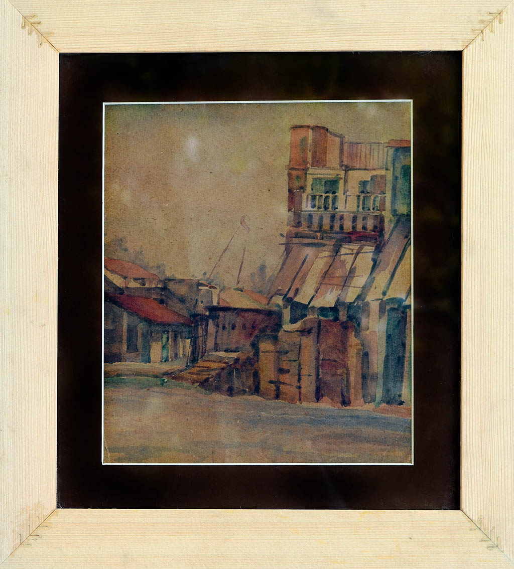 Ganesh Haloi’s watercolor captures an urban quietude, where muted buildings line an empty street under a soft, atmospheric sky. The subdued earth tones and delicate brushwork evoke a sense of memory—faded, contemplative, and gently melancholic. Architectural forms dissolve into abstraction, suggesting both presence and absence in the city’s rhythm. It’s a meditative landscape, where silence speaks through shadow and structure.