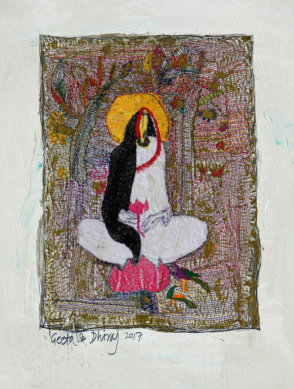 A meditative penguin, adorned in a yellow cap and pink skirt, sits cross-legged like a sage, merging whimsy with quiet dignity. Its wings rest gently on its knees, evoking a posture of introspection amid a tapestry of abstract trees and earthy textures. The background pulses with embroidered rhythms—reds, browns, and greens—suggesting a forest of memory or myth. Geeta and Dhiraj Choudhary’s 2017 creation blurs species and spirit, inviting reflection on identity, stillness, and playful transcendence.