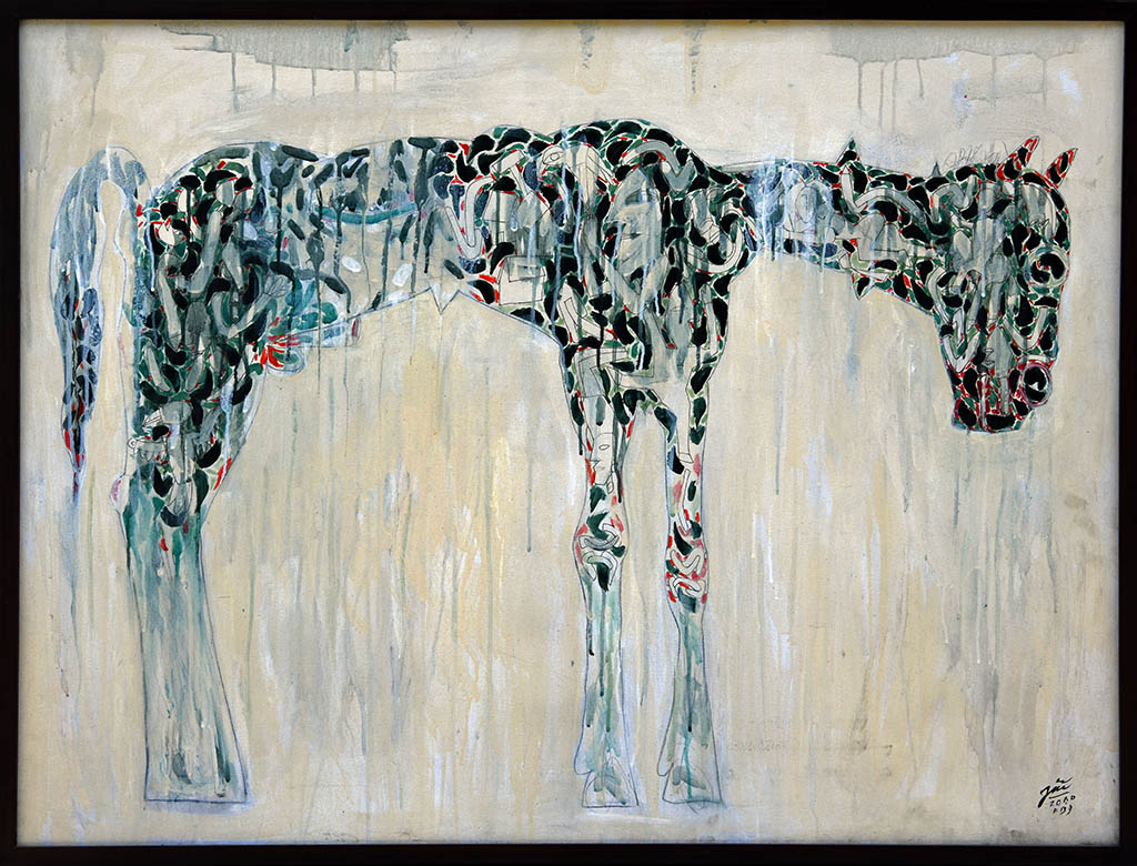 Jai Zharotia’s horse stands like a mythic cipher—its bowed head and calligraphic body etched with swirling patterns that seem to whisper forgotten scripts. Rendered in black, red, green, and white against a rain-streaked beige, the creature feels both grounded and spectral, as if caught between motion and meditation. The vertical drips in the background evoke…