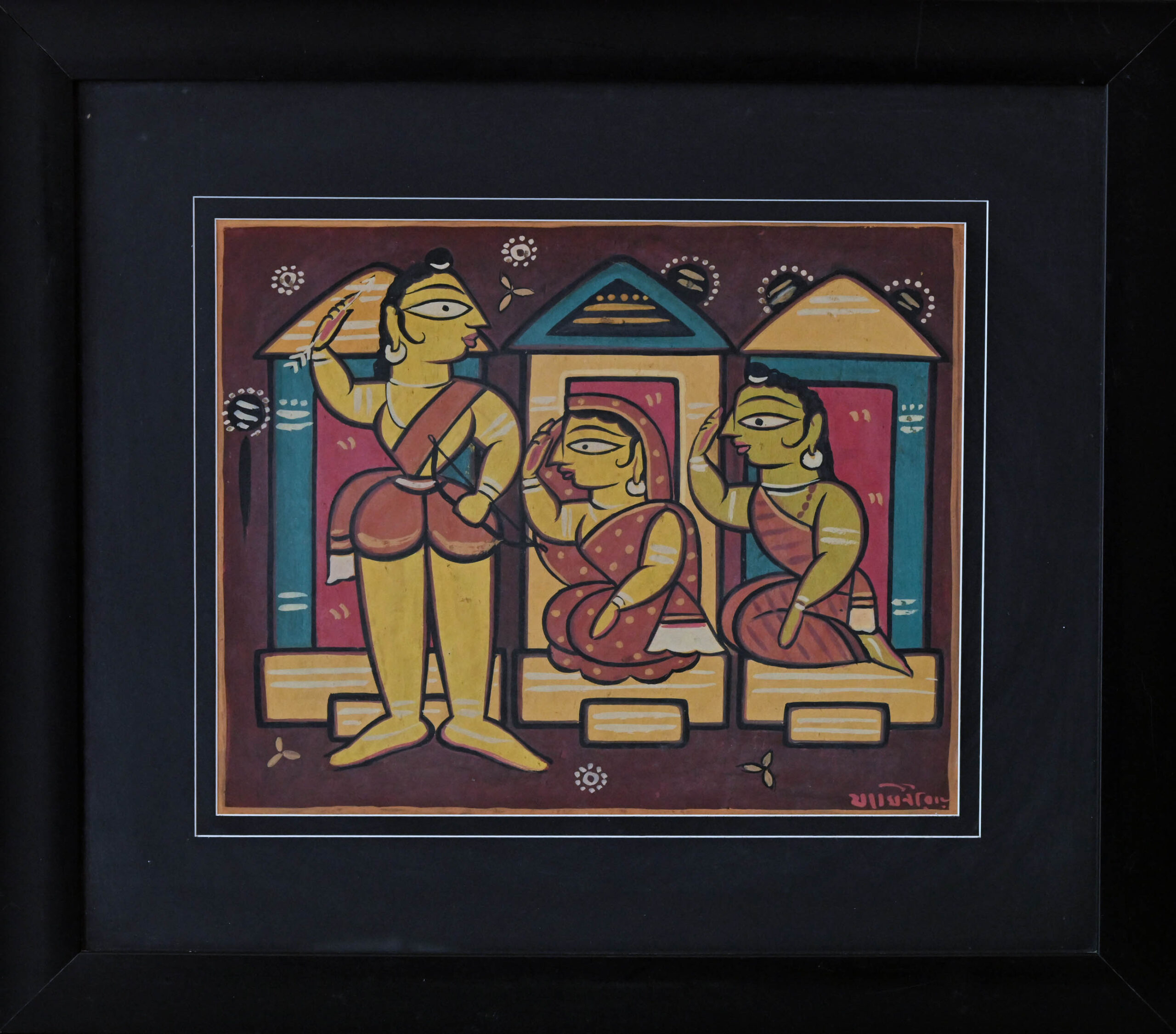 Three stylized figures gather before temple-like structures, their gestures and attire echoing the rhythms of village life. Bold lines and earthy tones frame the scene with Jamini Roy’s signature folk aesthetic—where simplicity becomes sacred. The triangular roofs and floral motifs evoke ritual and storytelling, grounding the composition in cultural memory. Through flattened forms and expressive posture, the artwork celebrates community, tradition, and the quiet poetry of everyday interaction.