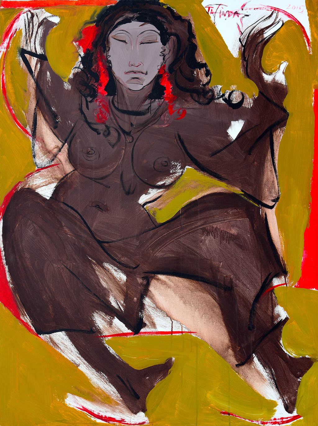 This expressive painting by Jatin Das captures a stylized human figure in a dynamic, almost contorted pose, rendered with bold brushstrokes and earthy tones. The muted gray face with closed eyes suggests introspection or emotional withdrawal, while the red accents around the head and background evoke intensity and inner fire. Das’s use of exaggerated limbs and abstract composition creates a visceral sense of movement and psychological tension. The artwork becomes a raw meditation on solitude, vulnerability, and the fragmented nature of human experience.