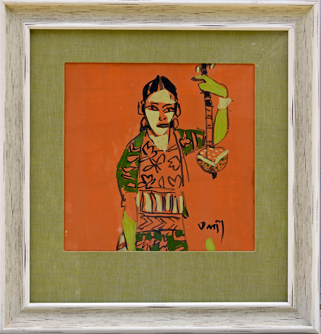 This vibrant artwork,  echoes the spirit of K.G. Subramanyan’s playful yet profound visual language, where tradition meets modernity in bold, graphic form. A stylized figure cradles a stringed instrument against a flat orange backdrop, its patterned attire and simplified anatomy evoking folk motifs and theatrical storytelling. The contrast between intricate floral designs and abstract geometry reflects Subramanyan’s love for layering cultural memory with contemporary design. It feels like a lyrical pause—where music, identity, and visual rhythm converge in quiet celebration.