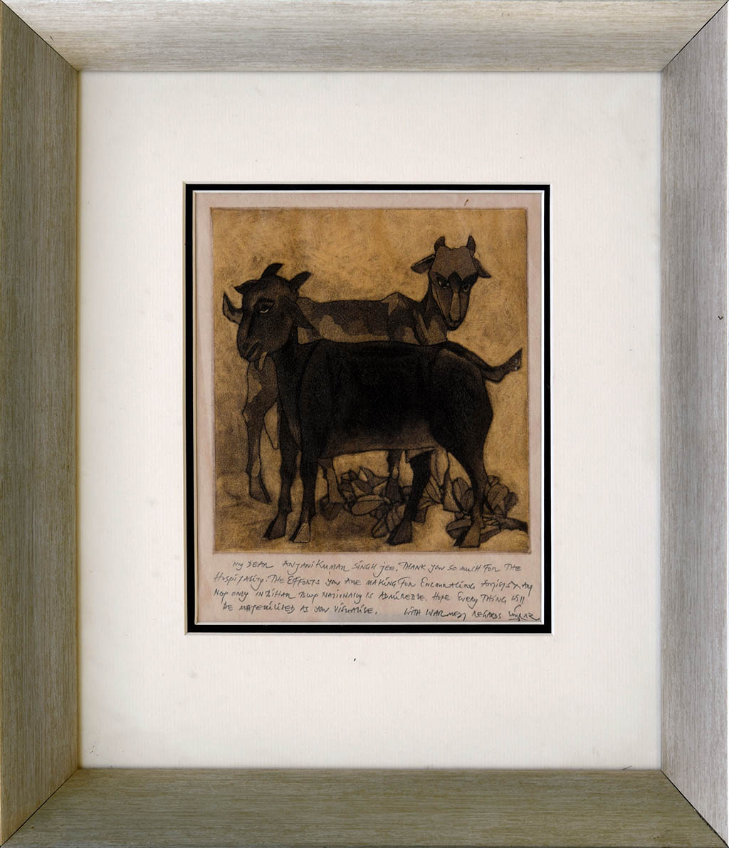 Laxma Goud’s artwork presents two goats in earthy tones, their forms stylized yet grounded in rural intimacy. The textured background and muted palette evoke a rustic quietude, where animal presence feels both symbolic and familiar. Framed with care and accompanied by a heartfelt note, the piece becomes a memory—of hospitality, identity, and sacred connection. Goud’s vision honors everyday life with reverence, turning simplicity into soulful reflection.