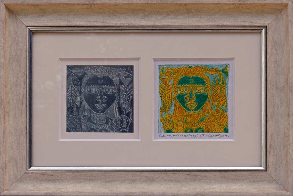 This dual-toned print by Laxma Goud showcases his mastery of line, texture, and emotional nuance, presenting two stylized portraits that echo rural identity and introspective grace. The left panel, rendered in monochrome, evokes quiet contemplation, while the right bursts with yellow and green vibrancy, suggesting vitality and transformation. Intricate facial patterns and decorative motifs reflect Goud’s deep engagement with folk aesthetics and the sensuality of everyday life. Together, the prints form a visual dialogue—between shadow and light, memory and renewal, tradition and artistic evolution.