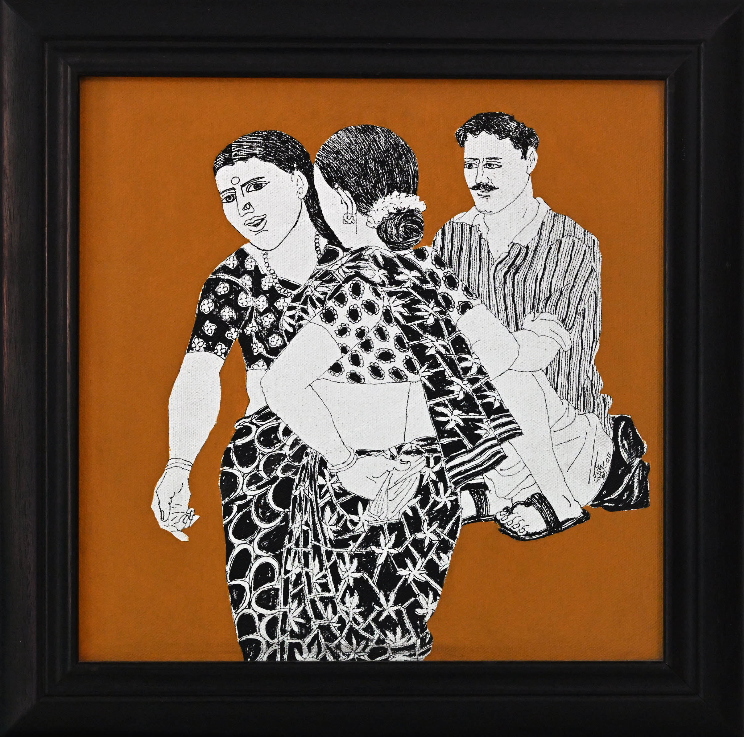 Two women in patterned sarees share a quiet moment, their postures and expressions capturing the intimacy of everyday conversation. A seated man in the background observes silently, adding a layer of social tension or quiet curiosity. The bold orange backdrop contrasts with the black-and-white figures, heightening their presence and emotional resonance. Laxman Ailey’s stylized composition transforms a simple scene into a cultural tableau—where gesture, gaze, and textile become storytelling.