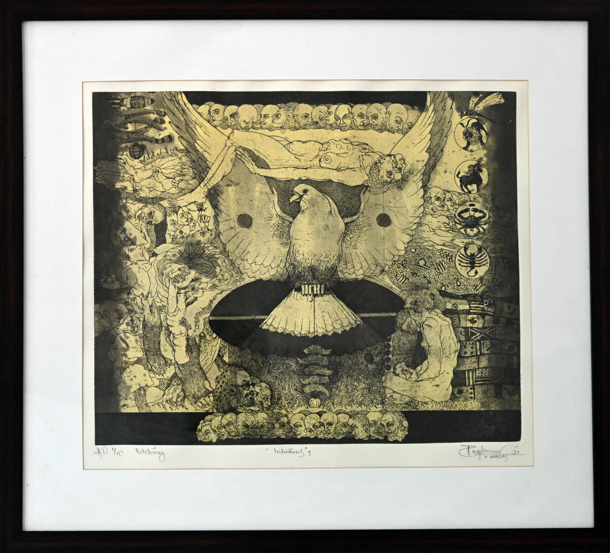 A central bird, poised with wings outstretched, anchors the composition like a spiritual sentinel amid chaos. Surrounding it, Nag Das conjures a dense wilderness of skulls, insects, and fragmented human forms—symbols of mortality, memory, and myth. The symmetrical etching pulses with surreal tension, where nature and decay entwine in ritualistic harmony. “Wilderness 3” becomes a shrine to the untamed psyche, etched in monochrome reverence.