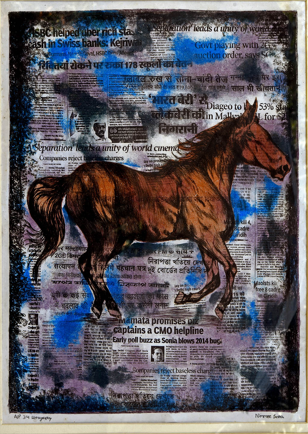 A lone horse strides through a storm of headlines, its natural grace sharply contrasted against the chaotic collage of media clippings in Hindi and English. Nimmee Sinha renders the animal with expressive realism, anchoring it in a world saturated by politics, finance, and entertainment. Blue and black paint splatters erupt across the surface, disrupting the…