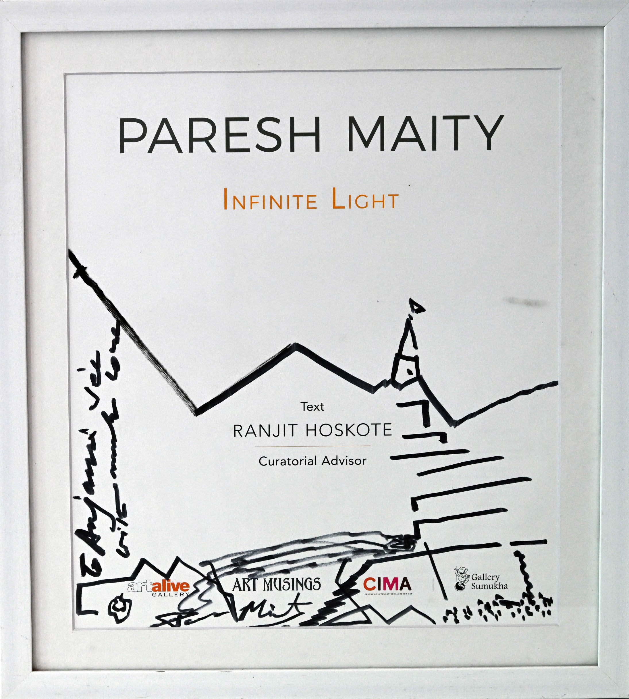 Paresh Maity’s Infinite Light unfolds as a poetic landscape, where abstract lines trace the ascent toward a temple-like form. The composition balances architectural suggestion with spiritual symbolism, inviting contemplation through minimal strokes and layered textures. Handwritten script adds intimacy, echoing the personal and philosophical depth of the journey. This artwork becomes a meditative passage—where structure, light, and silence converge.