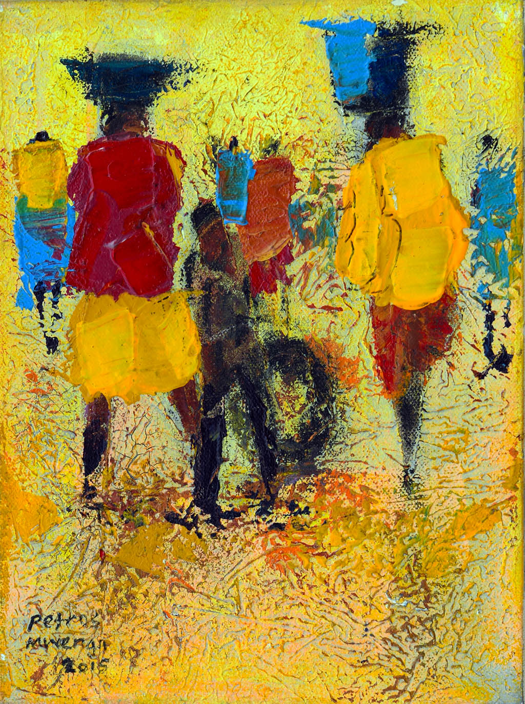 This vibrant painting by Petros Mwenga captures the rhythm of communal life through bold color, textured brushwork, and stylized human forms. Figures in traditional attire stride forward with purpose, their movement echoed by the warm yellow backdrop that radiates energy and connection. The central trio—possibly a family—anchors the composition, while surrounding silhouettes suggest a bustling, shared journey. Mwenga’s work, rooted in documenting everyday social activities, transforms ordinary scenes into expressive celebrations of culture, resilience, and togetherness.