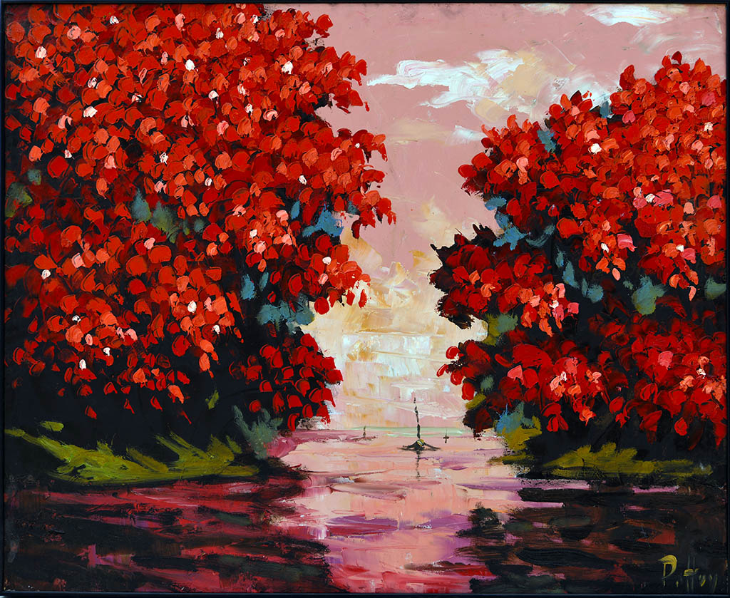 This serene landscape painting by Pittui bathes the viewer in a dreamlike glow, where vivid red foliage frames a tranquil waterway leading to a soft, radiant horizon. The warm pink and white sky blends seamlessly with reflections below, creating a symmetrical harmony that evokes peace and introspection. A solitary figure or statue at the center adds a quiet focal point, inviting contemplation amid nature’s embrace. Pittui’s style, marked by emotional color and gentle geometry, transforms everyday scenery into a meditative passage through light and memory.