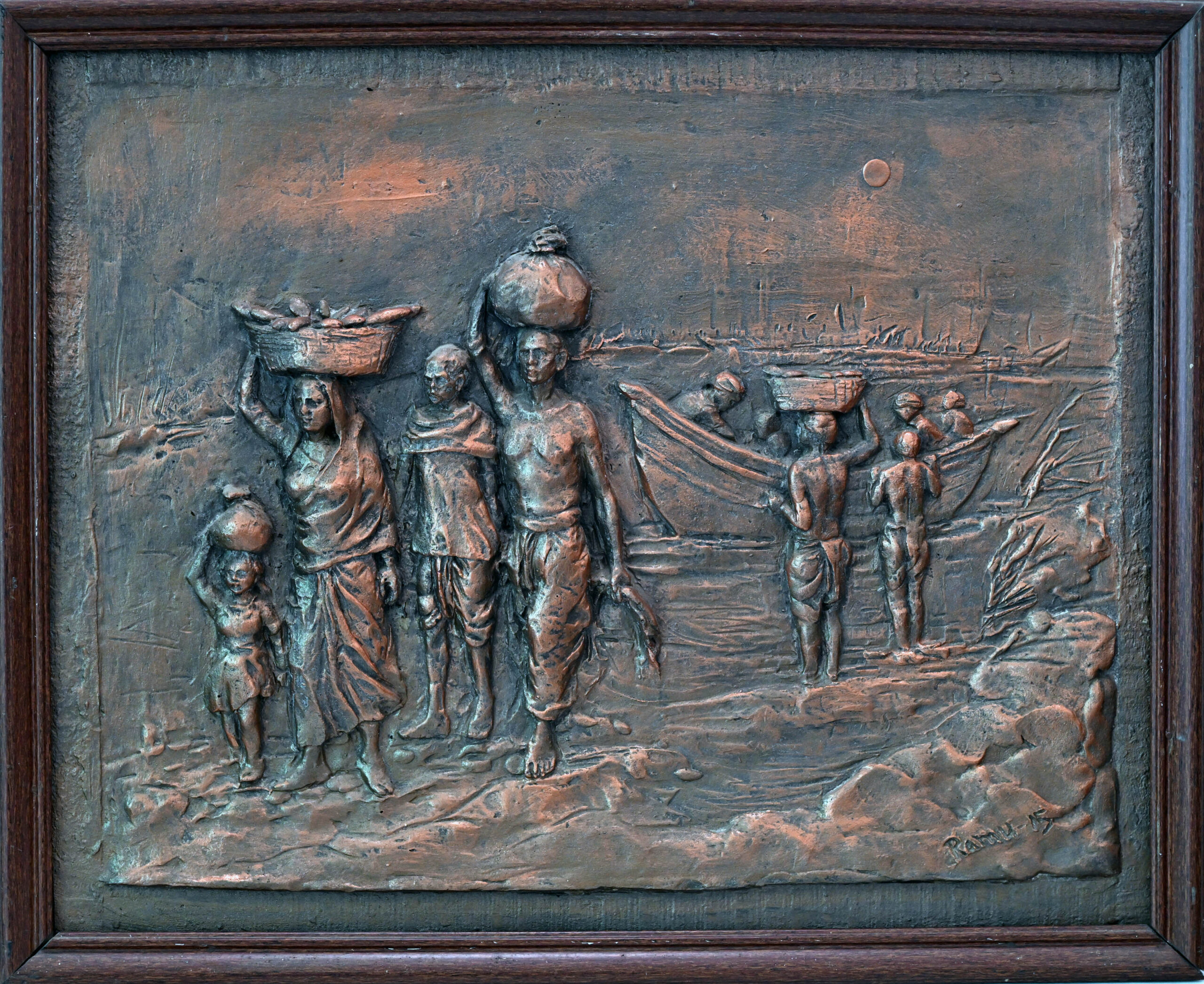 Ramu Kumar’s bronze relief captures the quiet dignity of rural life, as villagers move with purpose along a textured shoreline. Each figure—men, women, and child—bears baskets and bundles, their postures echoing the rhythm of daily labor and communal resilience. The distant boats and low sun evoke a timeless horizon, where livelihood meets landscape in poetic stillness. It’s a sculpted memory—where tradition, toil, and togetherness are cast in enduring form.