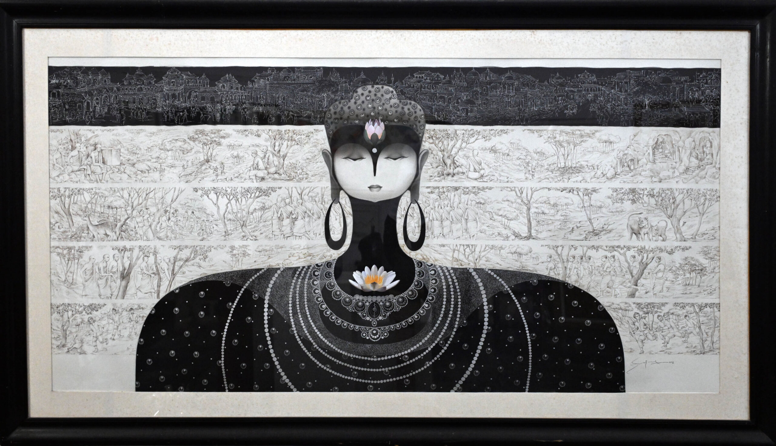 A serene figure adorned with lotus symbols gazes inward, wrapped in intricate patterns of grayscale elegance. Sanjay Kumar blends traditional iconography with contemporary linework, surrounding the central form with bands of trees, animals, and architecture. The lotus at the forehead and chest evoke purity and awakening, anchoring the spiritual essence of the piece. This artwork…