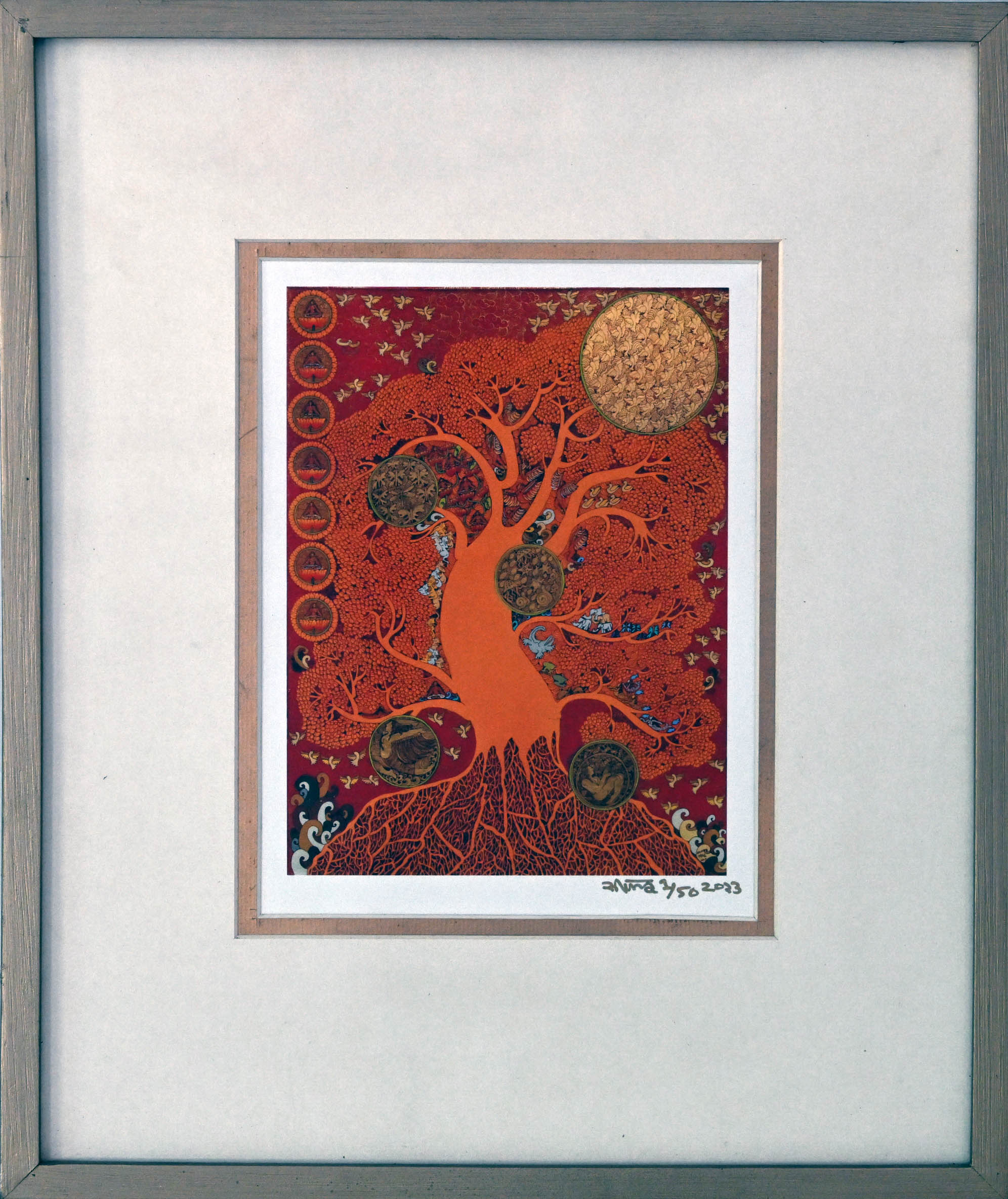 A radiant tree unfurls its intricate branches and roots against a crimson sky, glowing in warm orange tones. Celestial orbs orbit and nestle within its form, each etched with delicate patterns that evoke cycles, memories, and cosmic rhythm. Tiny birds and motifs flutter around, weaving a tapestry of life, spirit, and timeless connection. Seema Kohli’s vision blossoms as a sacred mandala of creation, where nature and divinity pulse in harmonious unity.