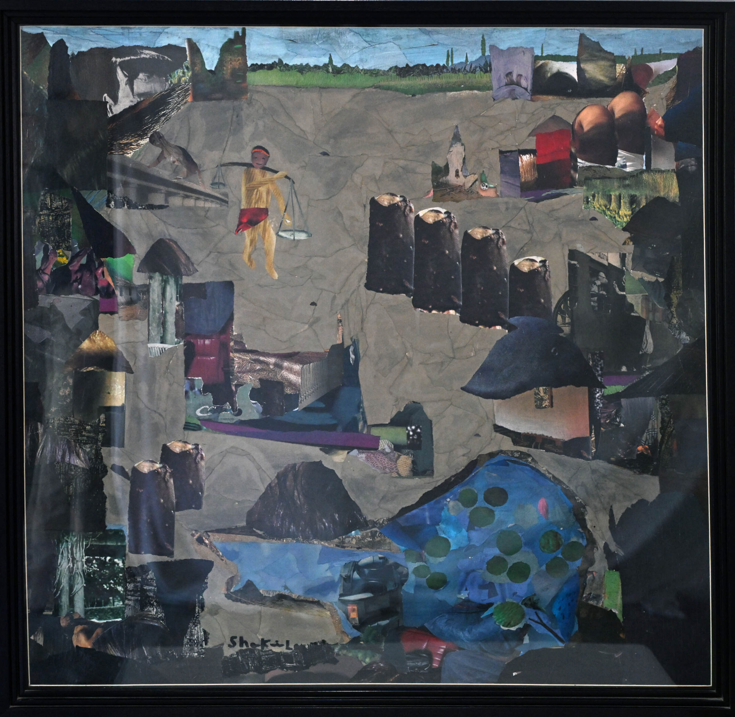 A surreal collage unfolds across a textured backdrop, where fragmented bodies, buildings, and symbols drift in layered dissonance. A central figure in yellow anchors the chaos, surrounded by tree stumps, muscular forms, and dreamlike architectural remnants. Blue and green patterns ripple through the lower quadrant, hinting at organic memory within an urban sprawl. Shakila’s composition…