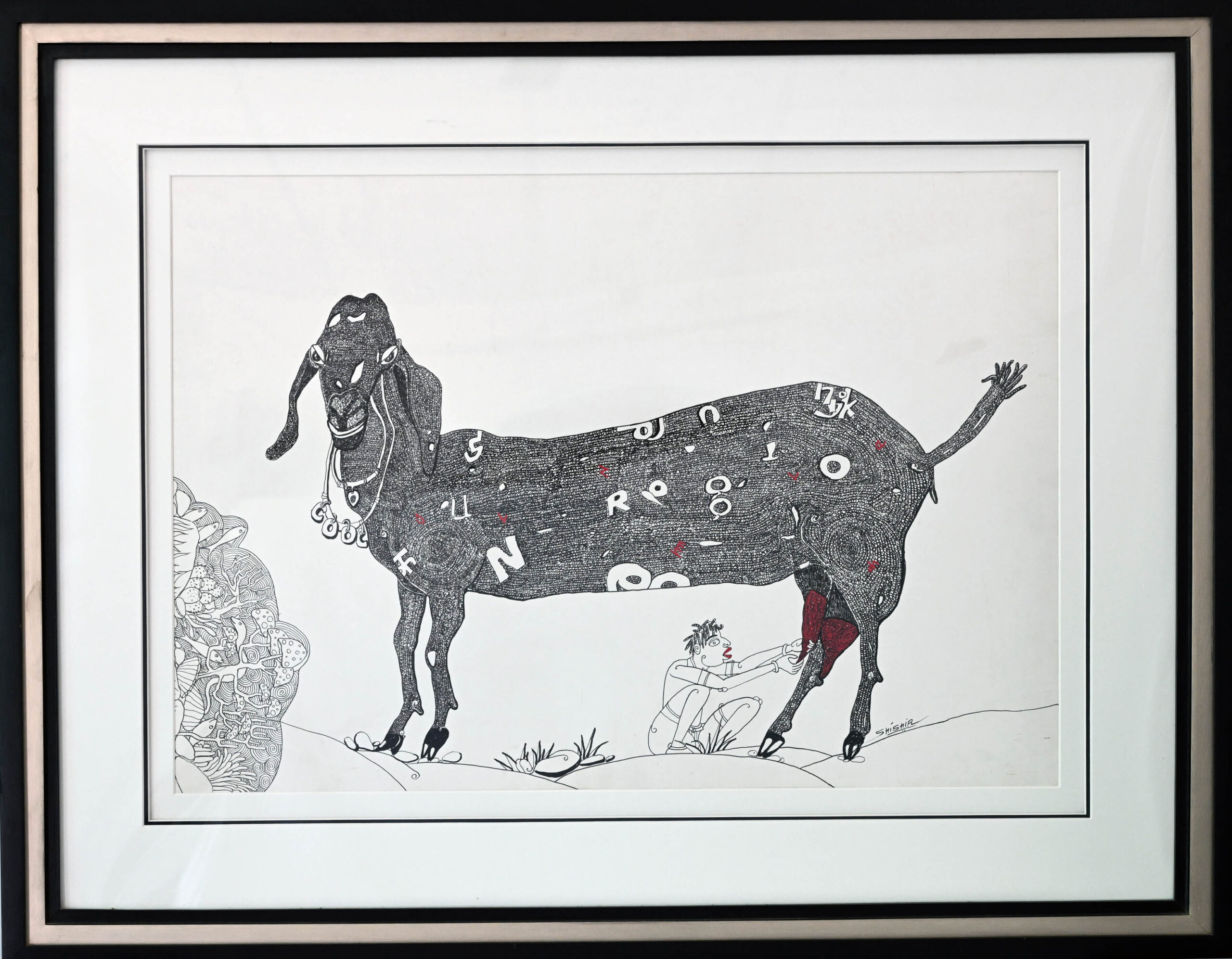 A towering black goat stands surreal and symbolic, its body inscribed with scattered letters like cryptic memories or fractured language. Beneath it, a human figure milks the beast, drawing red liquid—part blood, part metaphor—suggesting sacrifice, sustenance, or exploitation. To the side, a dense cluster of abstract faces and forms murmurs collective witness, amplifying the tension between silence and expression. Shishir Bhatt’s composition is a visceral allegory, where typography, ritual, and animal form converge in haunting introspection.