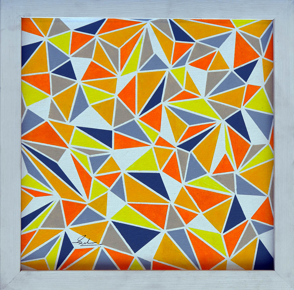 A lattice of triangles unfolds like a prism of thought—each shard a meditation in orange, navy, and gold. Sreedharan orchestrates geometry into rhythm, where symmetry is gently disrupted to evoke motion and tension. The palette, both earthy and celestial, bridges tradition with abstraction, inviting contemplation beyond the frame. Signed with quiet conviction, the work stands as a testament to design as both discipline and dream.