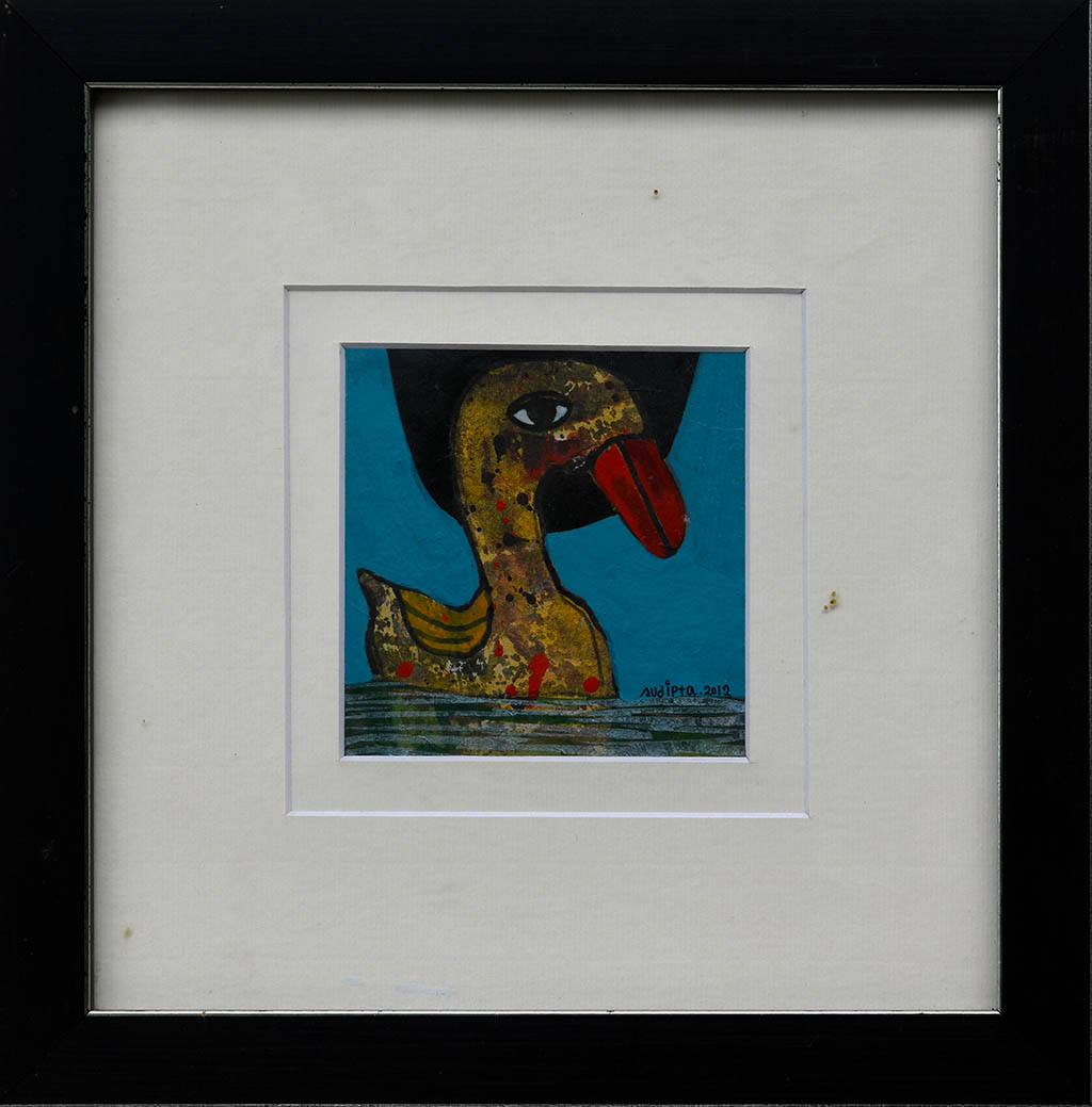 This whimsical painting by Sudipta reimagines a duck through a lens of abstraction and playful distortion, blending folk charm with contemporary stylization. Dominated by a bold red beak and textured strokes of yellow, brown, and ochre, the duck floats against a serene blue backdrop, its form both familiar and fantastical. A dark triangular shape hovers above, adding compositional tension and symbolic intrigue. Horizontal lines at the base suggest water, grounding the creature in a stylized aquatic setting. Sudipta’s expressive technique and vibrant palette evoke a childlike wonder while inviting deeper reflection on form, environment, and the imaginative possibilities of everyday subjects.