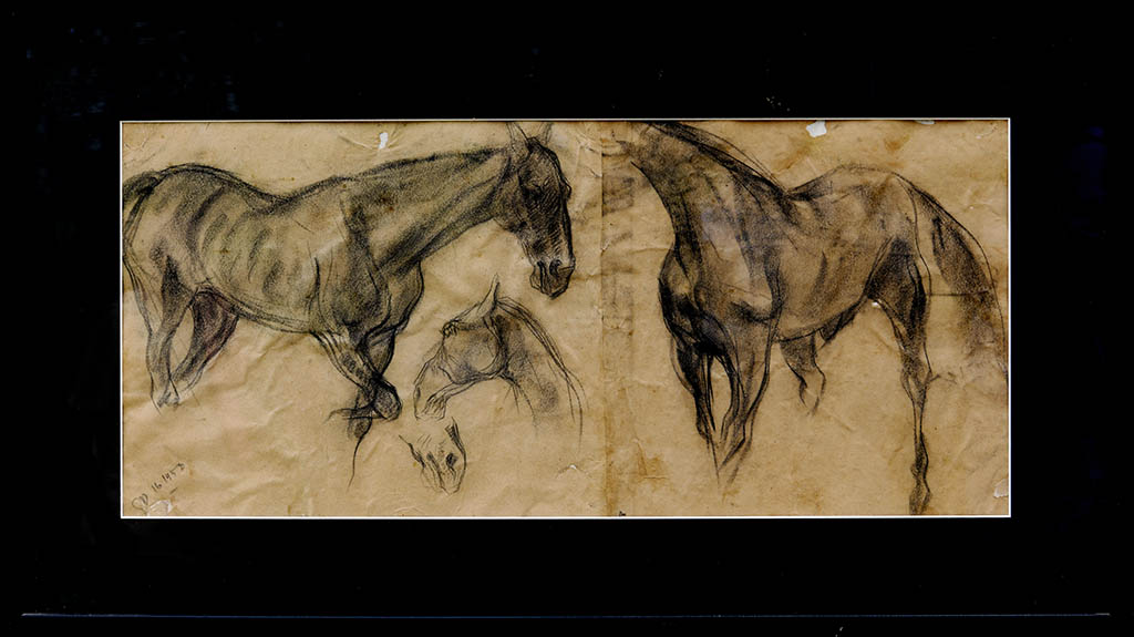 This dynamic sketch by Sunil Das exemplifies his celebrated mastery of equine anatomy and expressive draftsmanship, hallmarks of his iconic Horse Series. Rendered in charcoal or pencil on aged paper, the composition features multiple studies of horses—each pose capturing muscular tension, movement, and psychological depth. Das’s vigorous linework and anatomical precision reflect his fascination with rhythm and energy, transforming the horse into a symbol of primal force and emotional intensity. The interplay of detailed profiles and gestural strokes reveals both the artist’s technical rigor and his instinctive connection to the subject, affirming his stature as one of India’s foremost expressionist painters.