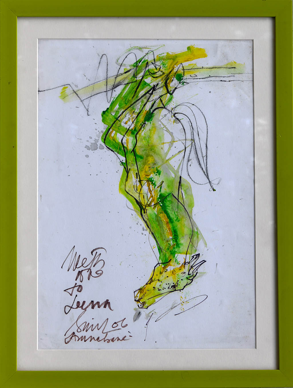 Sunil Das’s abstract figure, rendered upside down in green, yellow, and black, pulses with raw, kinetic energy. The expressive limbs dominate the composition, while the loosely defined torso and head evoke motion, imbalance, or emotional flux. Set against a stark white background and framed in vivid green, the artwork crackles with contrast and spontaneity. It’s…
