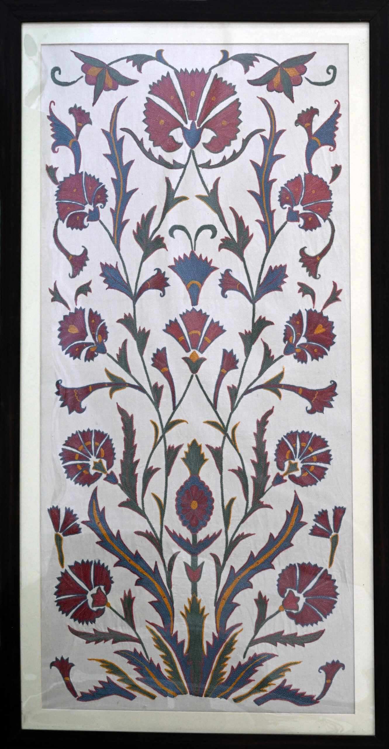 Delicate floral motifs bloom in symmetrical harmony, embroidered in vivid reds, purples, and greens on a pale textile field. Each stitch carries the rhythm of Tashkent’s Suzani tradition, where needlework becomes a language of heritage and celebration. The vertical arrangement evokes a garden of blessings, rooted in cultural memory and passed through generations. This textile radiates both craftsmanship and spirit, transforming fabric into a tapestry of identity and grace.