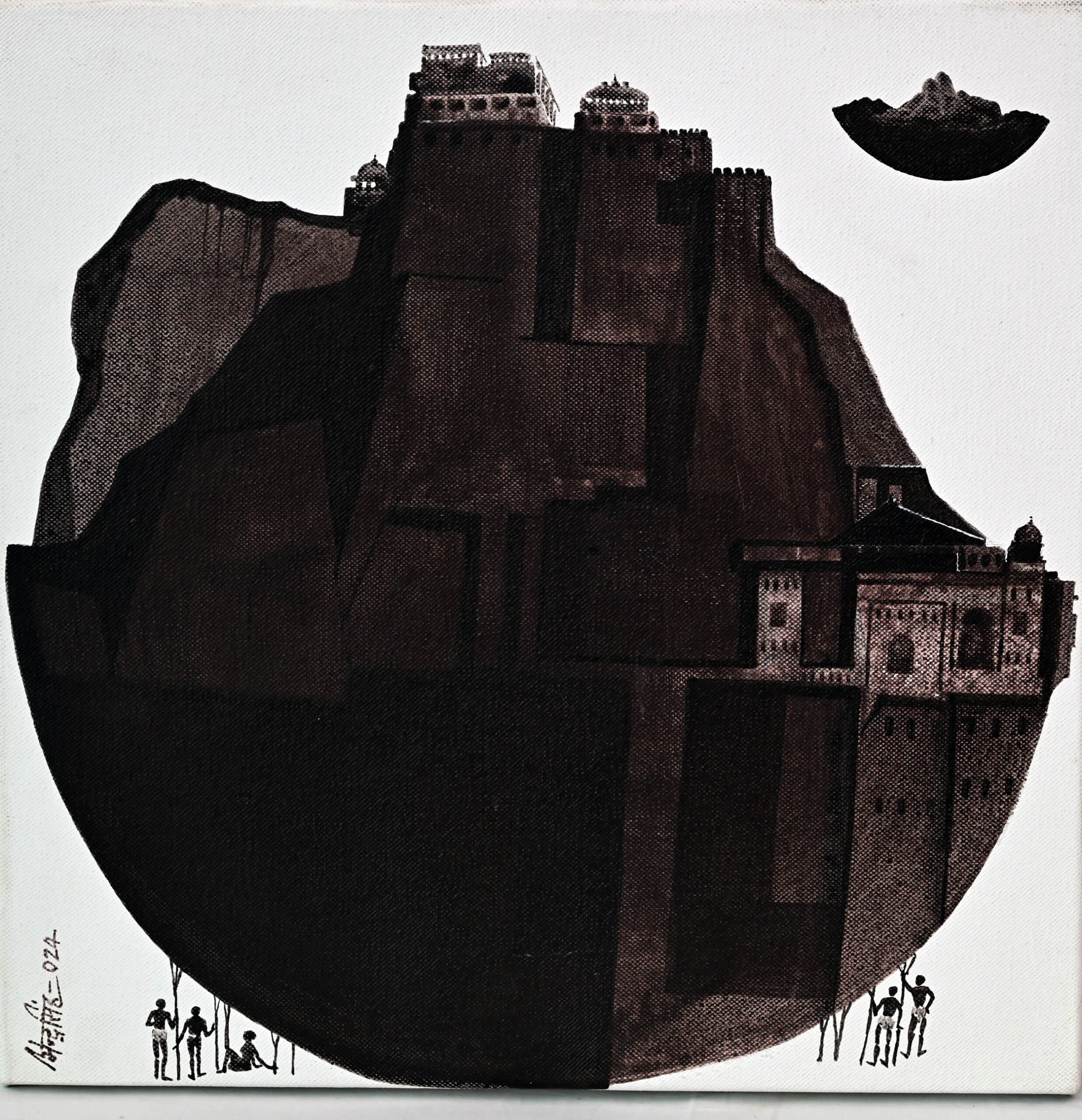 A monumental rock formation rises in stark geometry, its cubist planes carved with ancient domes and battlements. Tiny human figures gather at its base, their scale dwarfed by the surreal architecture, evoking awe and quiet reverence. A smaller circular echo of the mountain floats nearby, like a memory or myth refracted in time. Umendra Pratap Singh’s monochrome vision transforms stone into story, where history looms large and humanity gazes upward.